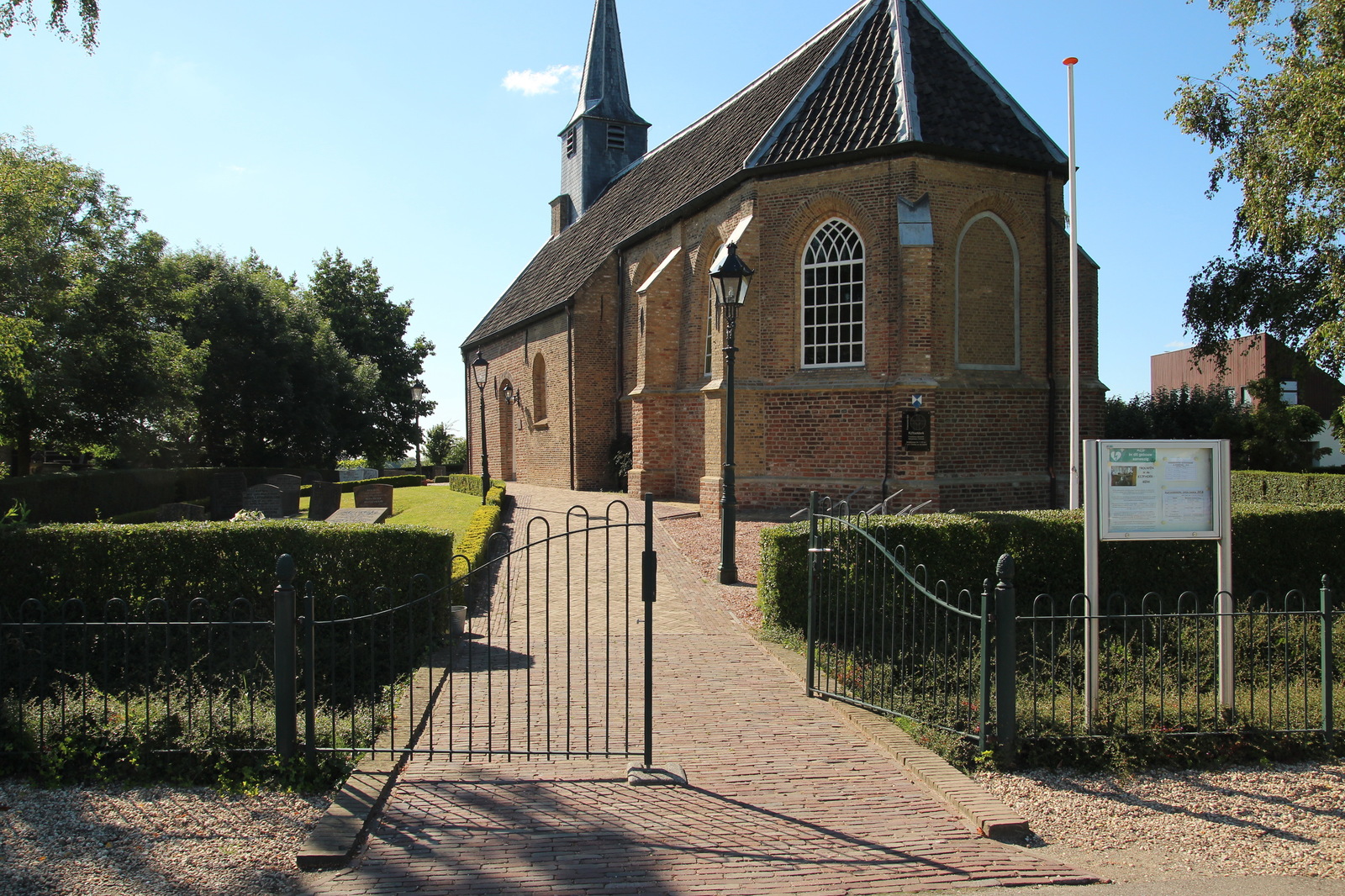 Natuurstenen waterpomp met bekroning, tussen de kerk...