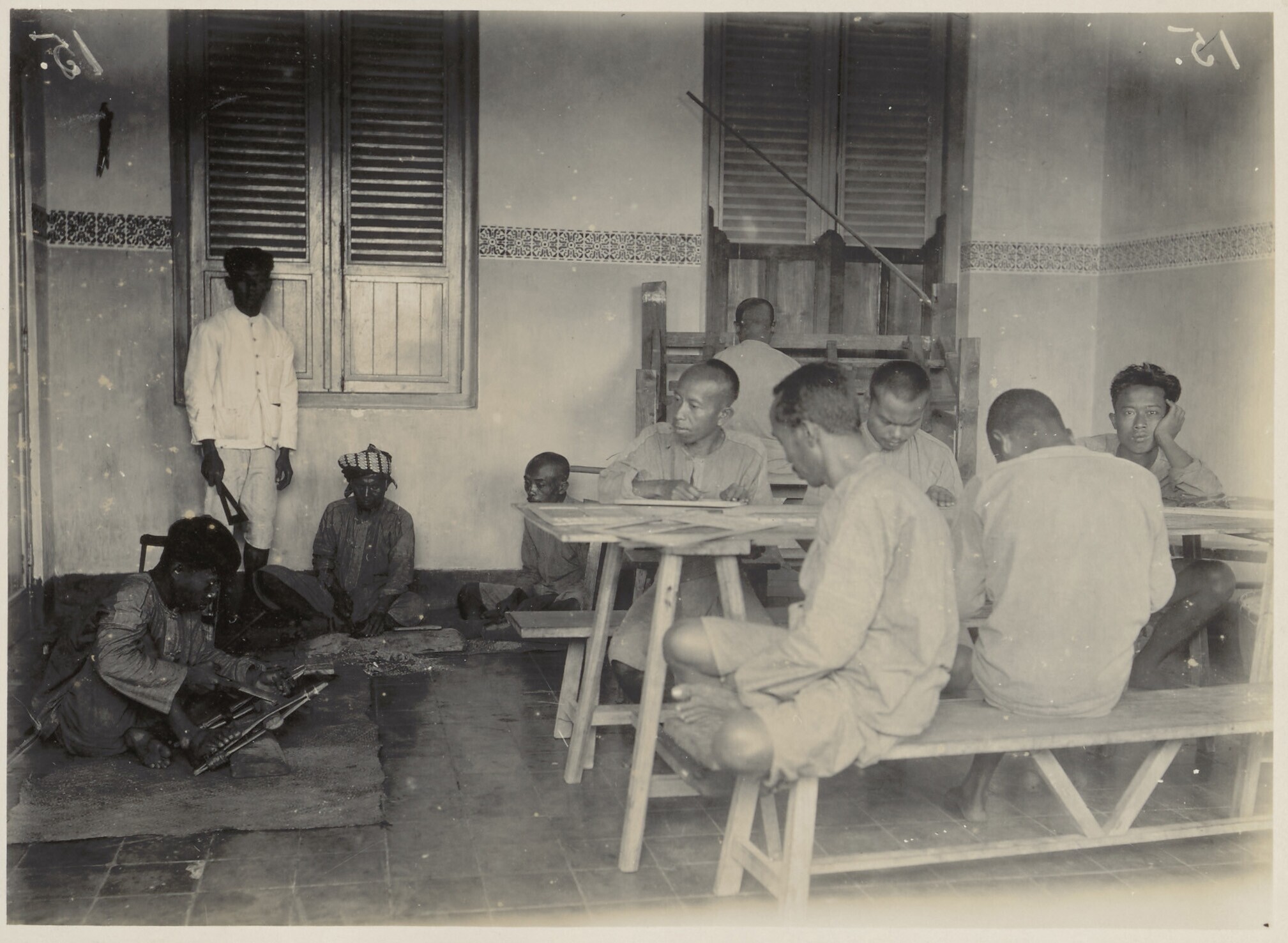 Wood carving patients during occupational therapy in...