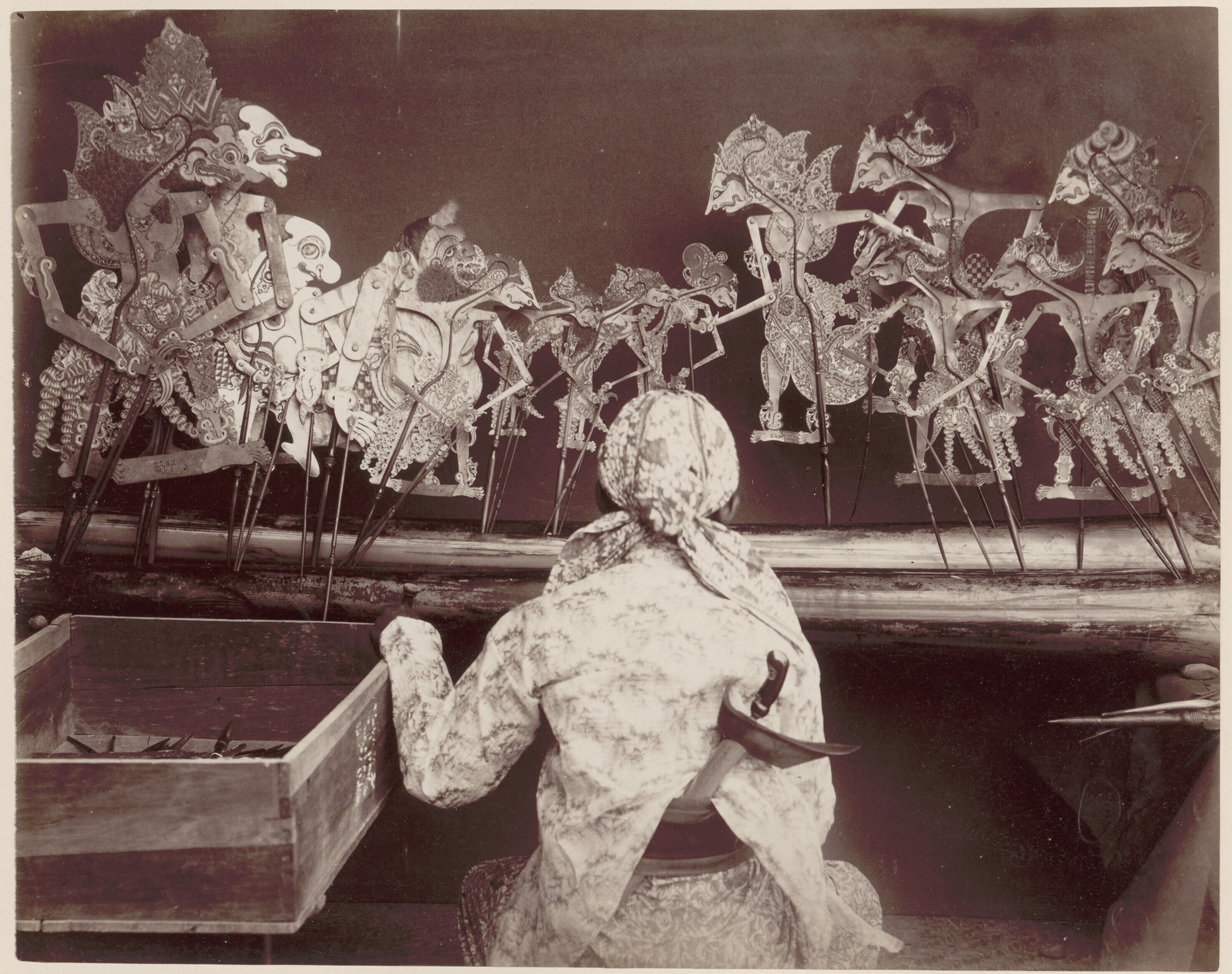 Een poppenspeler tijdens een wajang kulit voorstelling