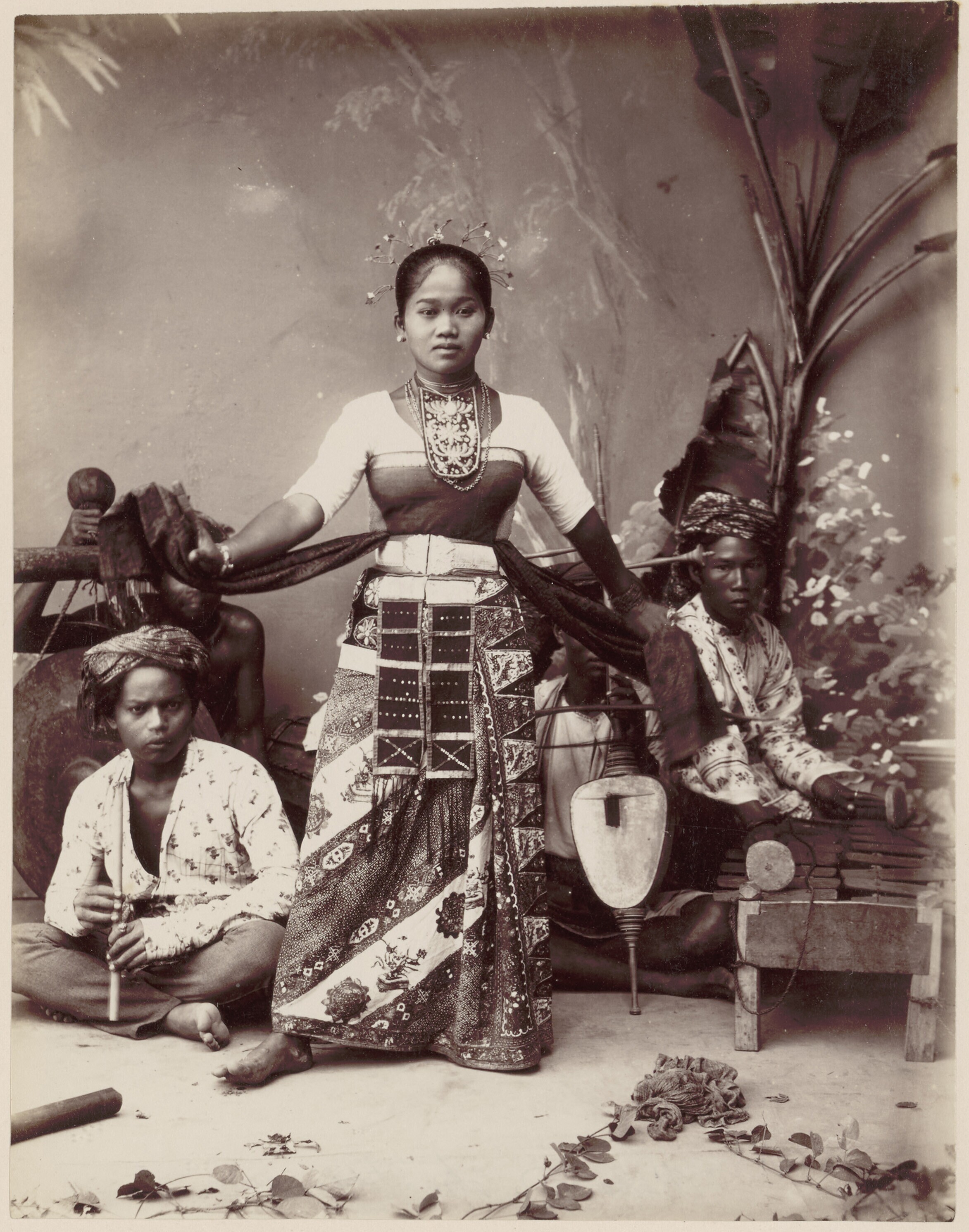 Studioportret van een ronggeng danseres met muzikanten