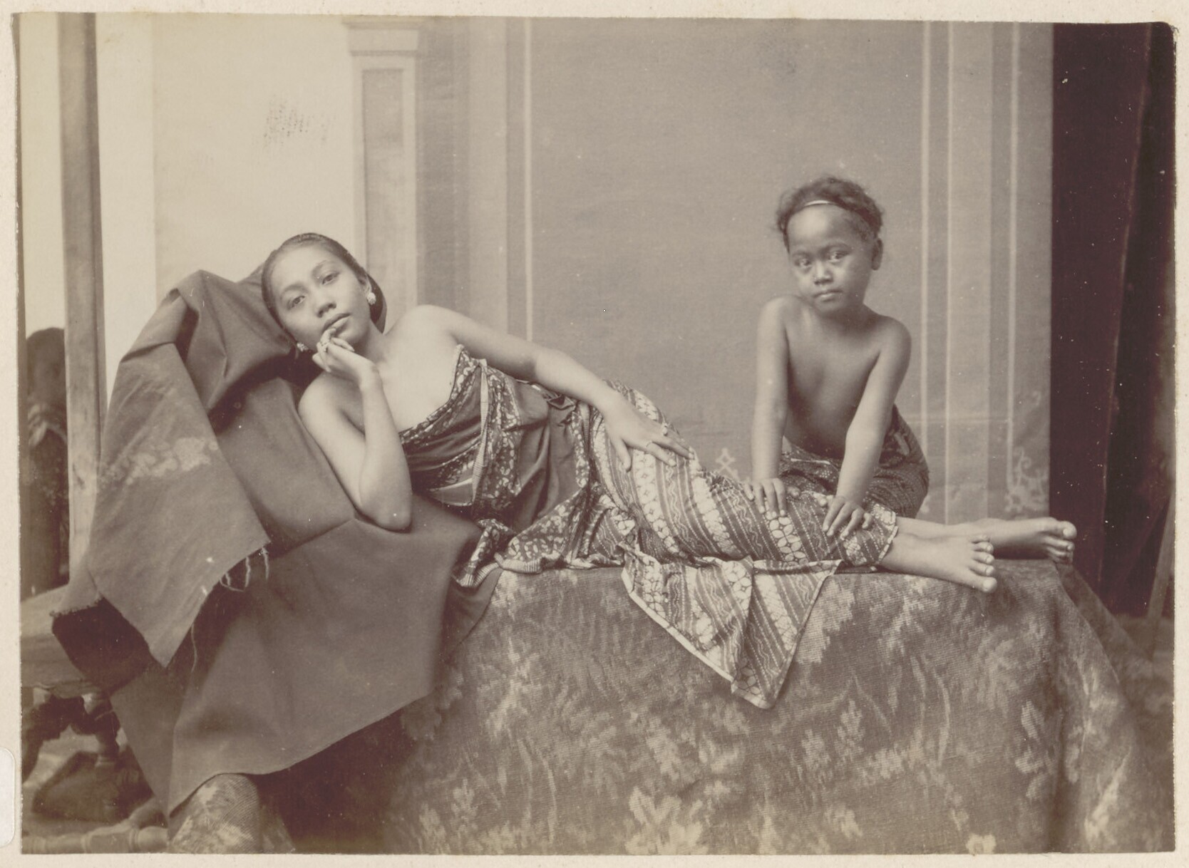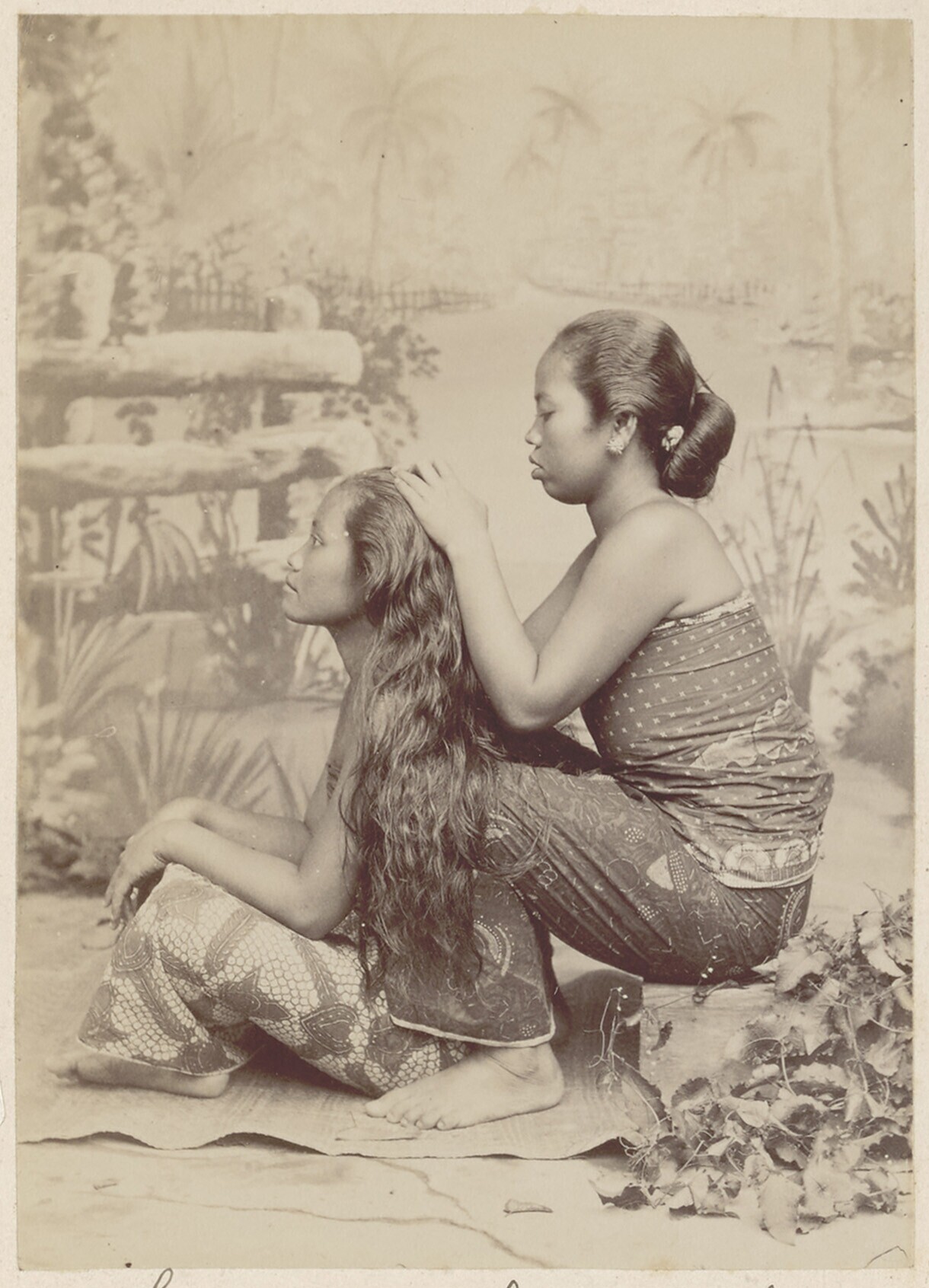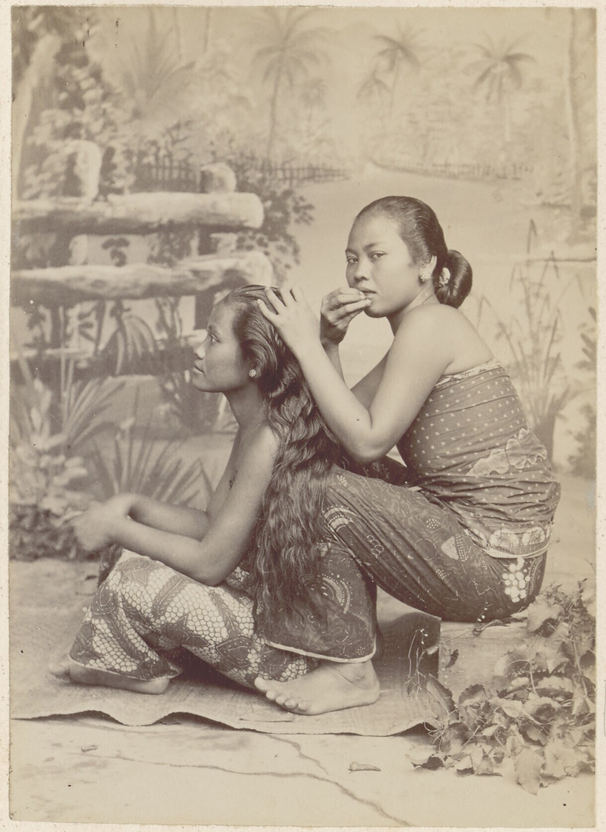 Studioportret van twee Javaanse vrouwen die elkaar o...