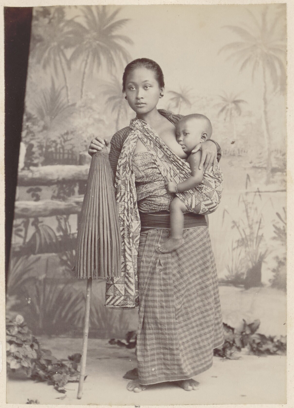 Studioportret van een Javaanse vrouw met haar baby a...
