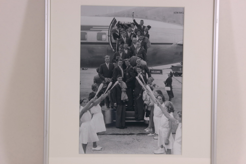 Een zwart-witfoto van de Nederlandse ploeg van de Ol...
