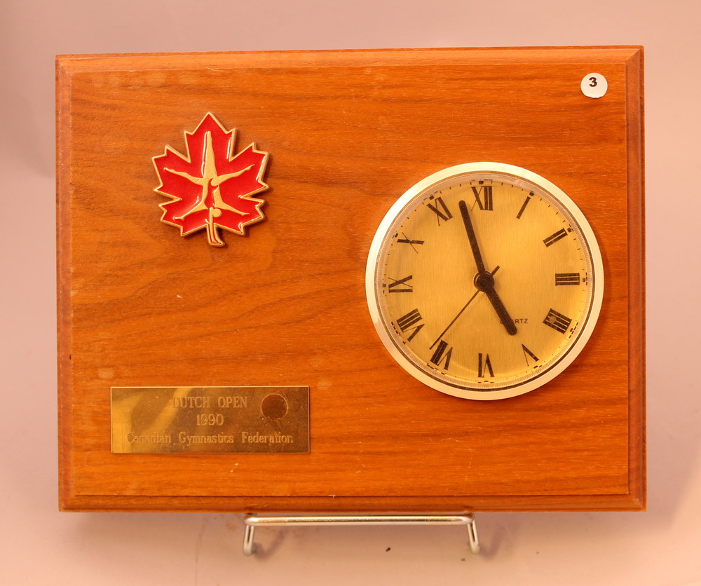 Plaquette met klok "Dutch Open 1990 Canadian Gymnast...