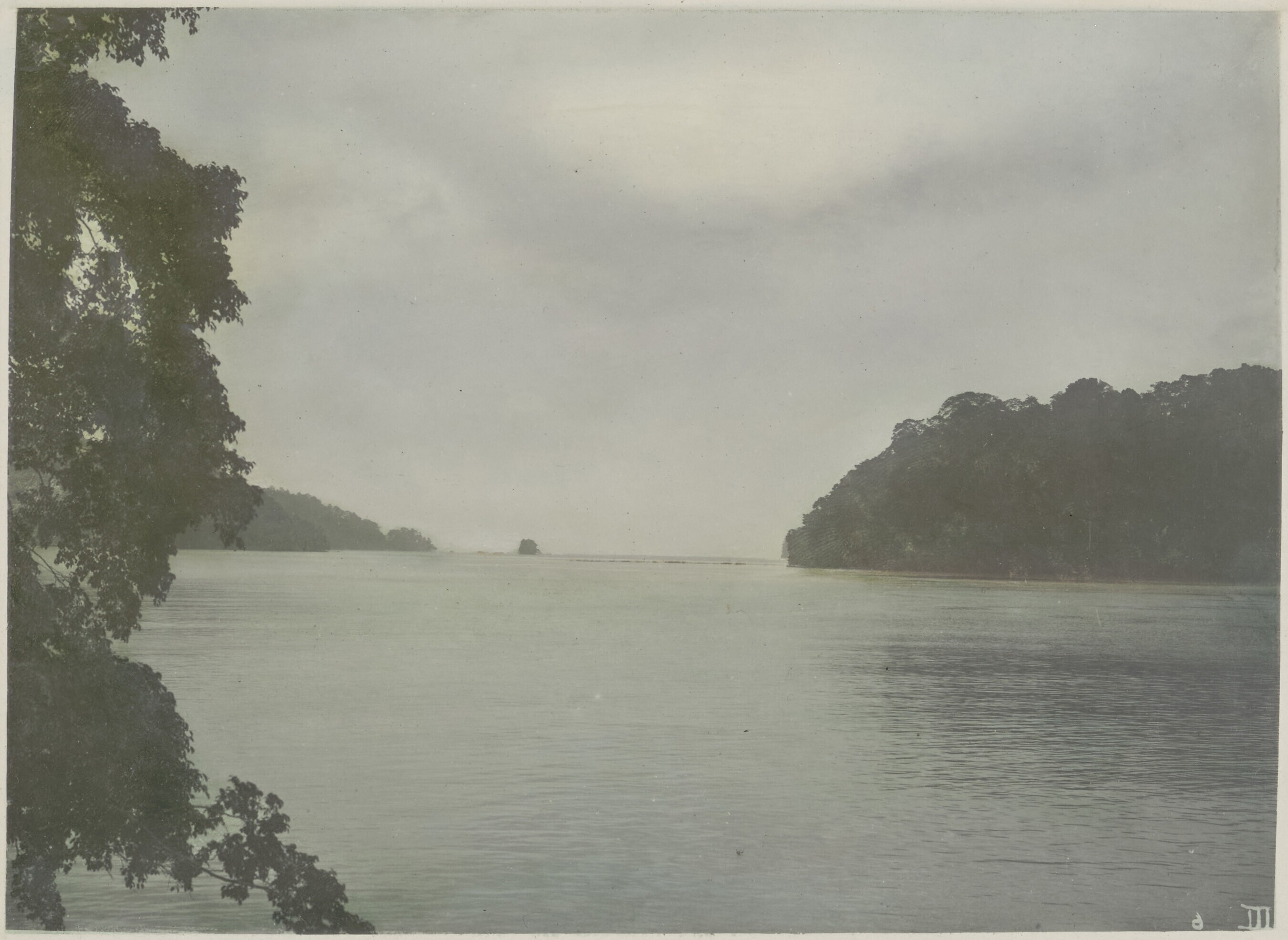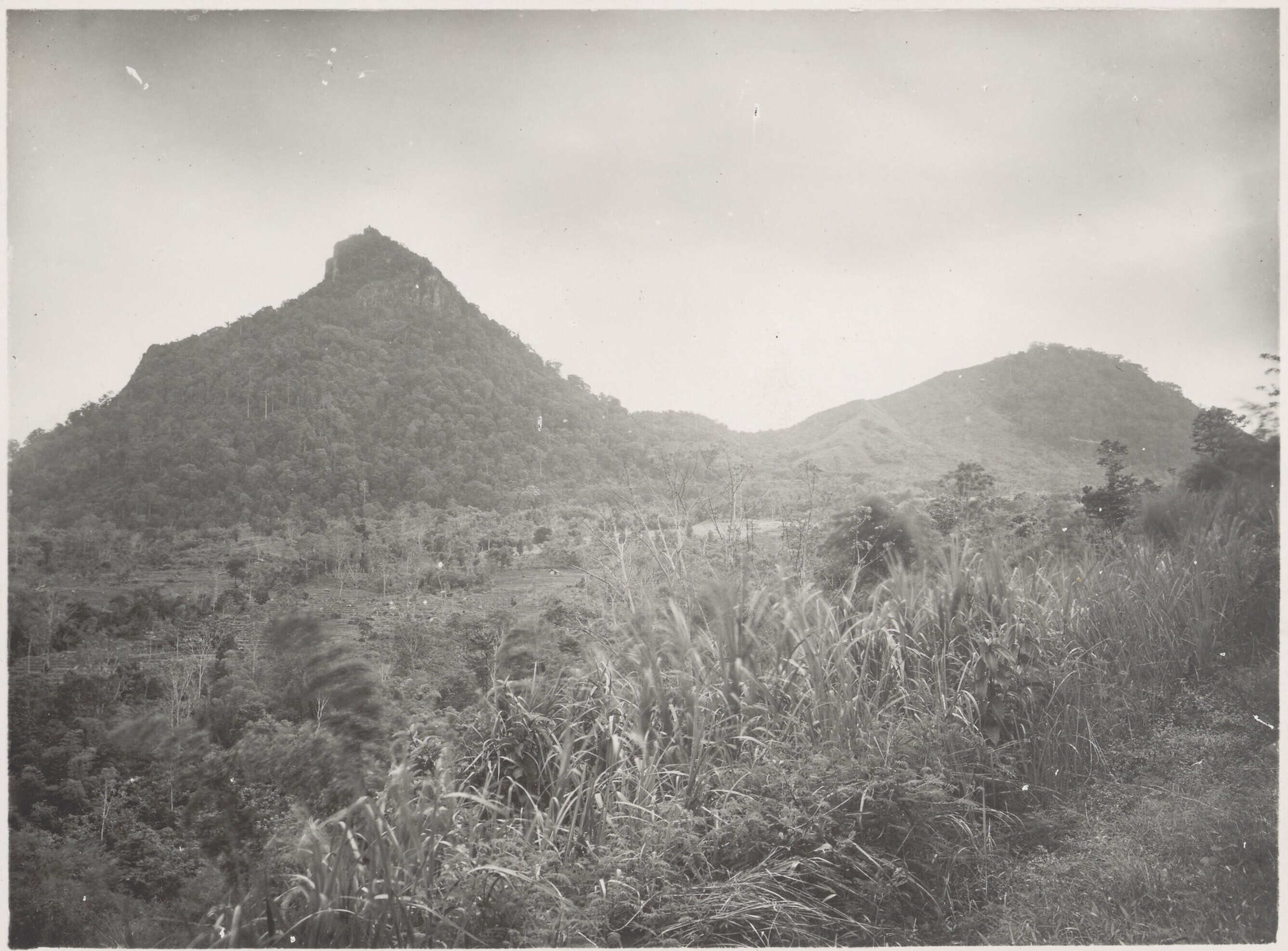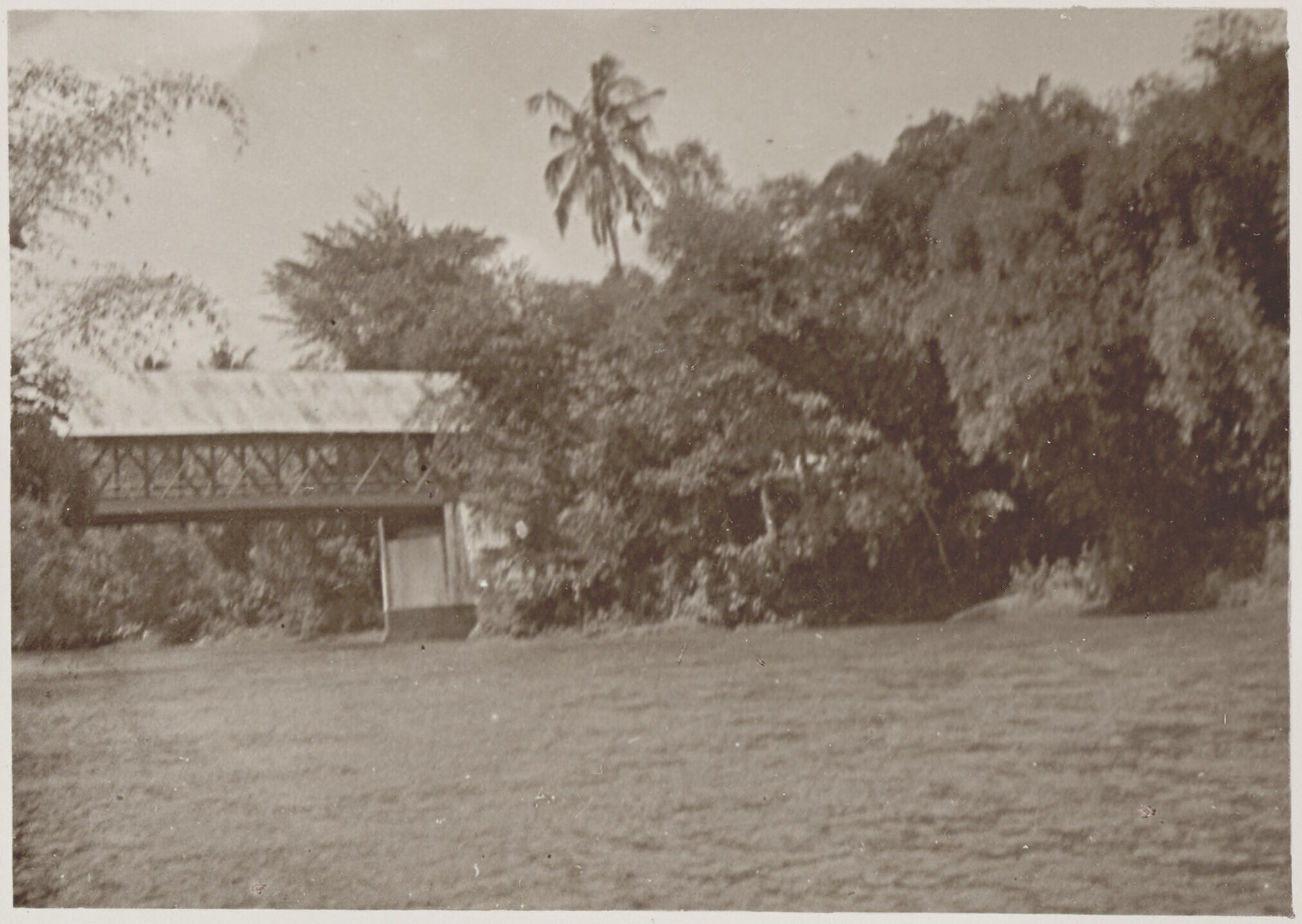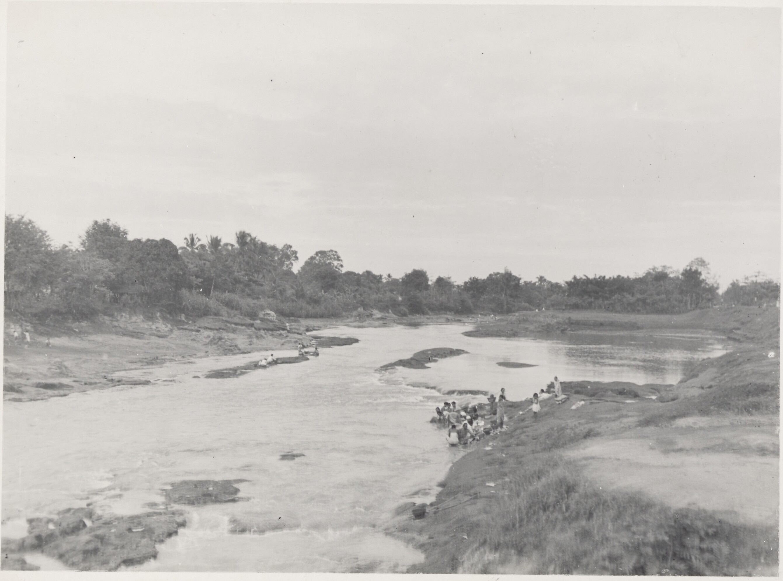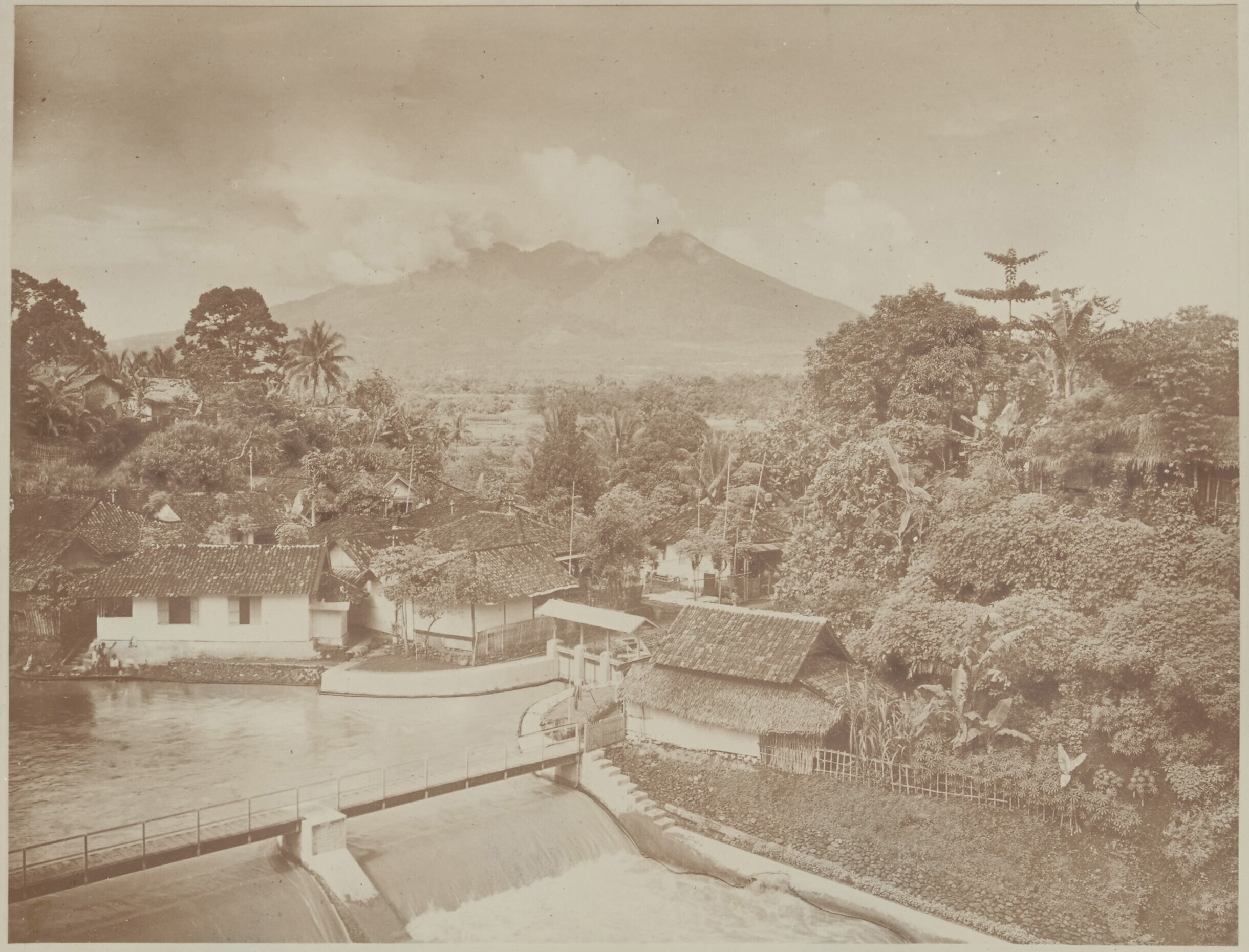 Stuw in Pledang (Buitenzorg), met de vulkaan Salak o...