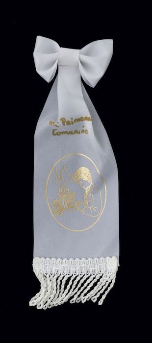 Wit vaantje met goudkleurige afbeelding en "Mi Prime...