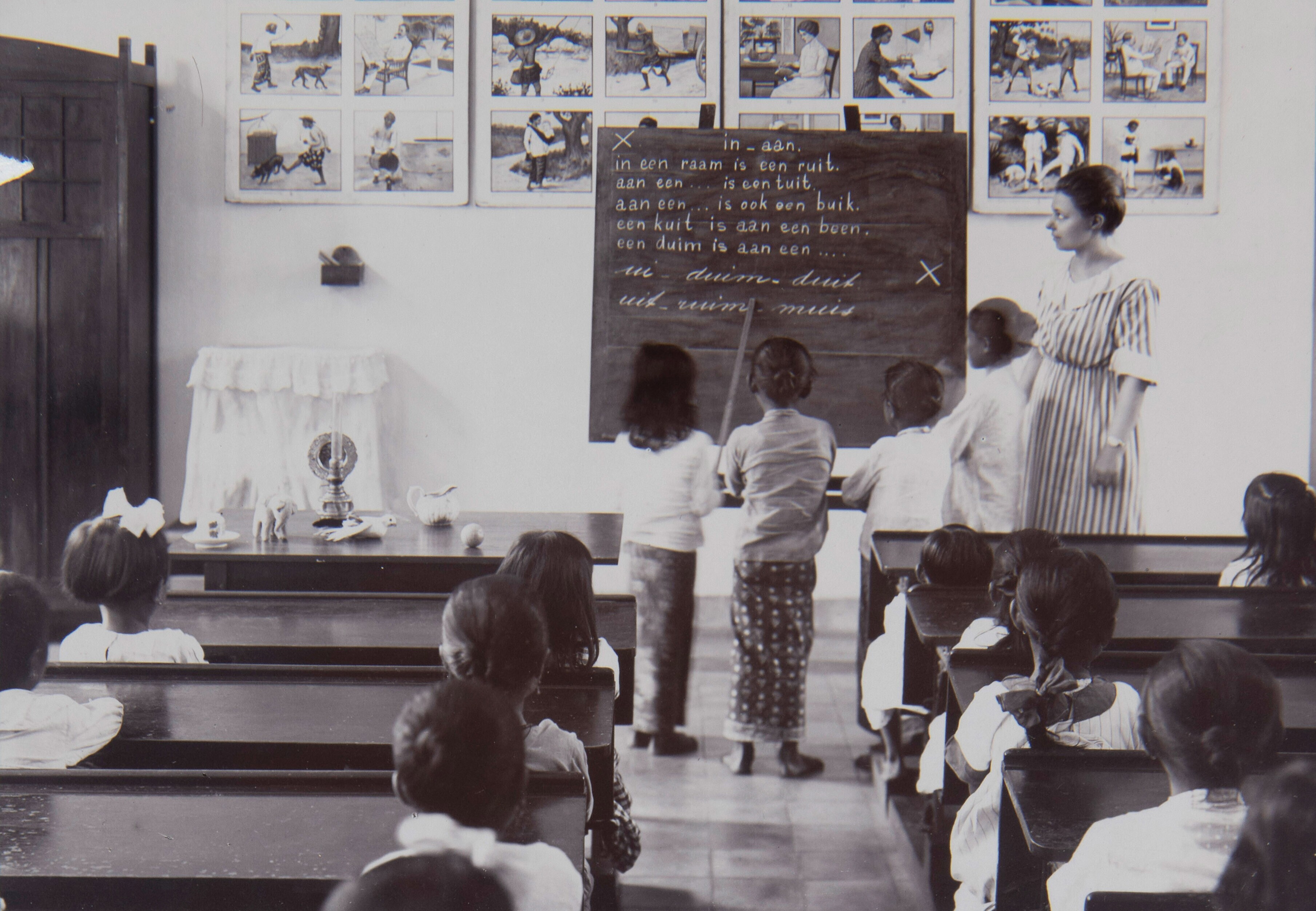 Onderwijzeres Hamer met leerlingen voor het schoolbo...