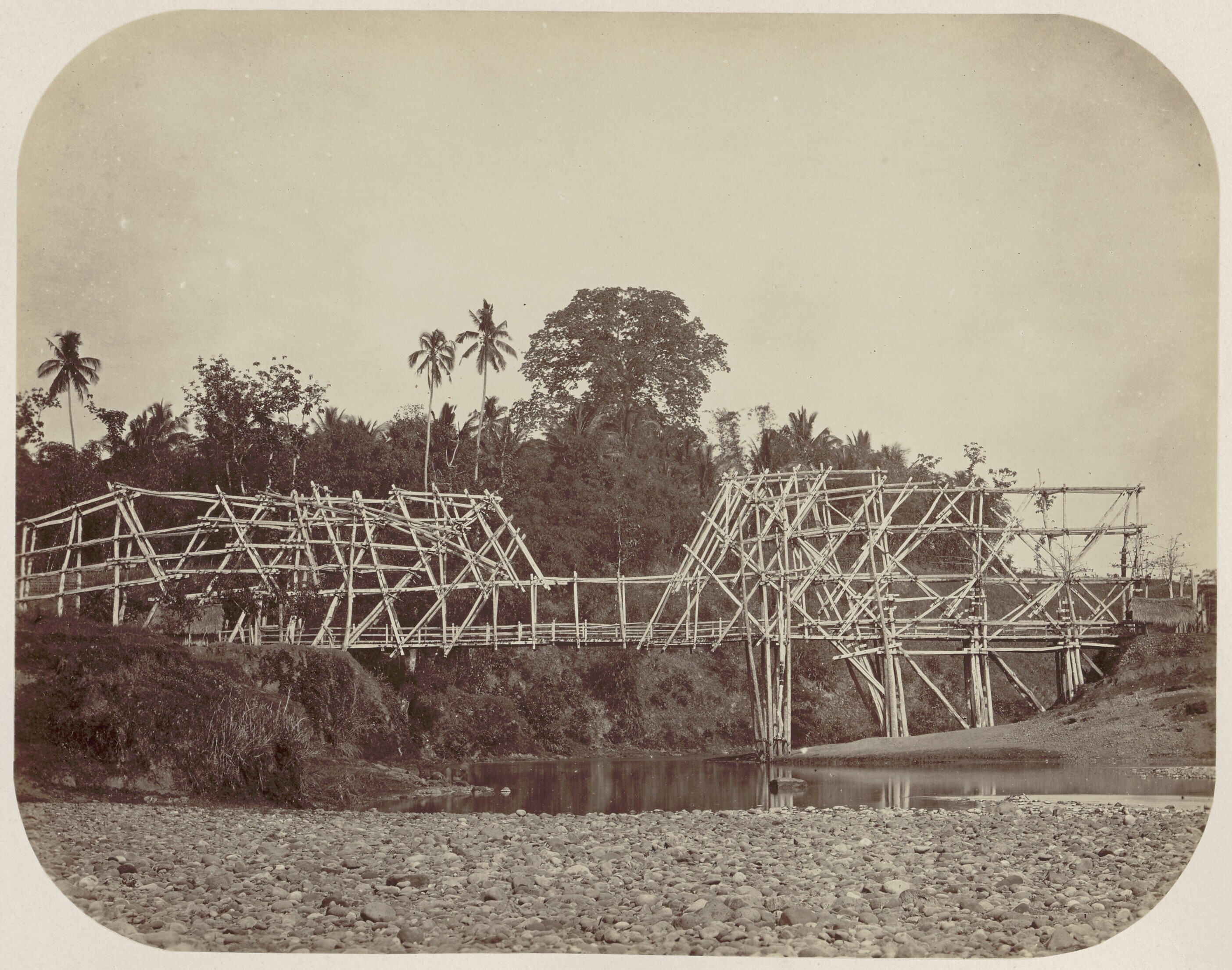 Brug van bamboe over een rivier bij Magelang