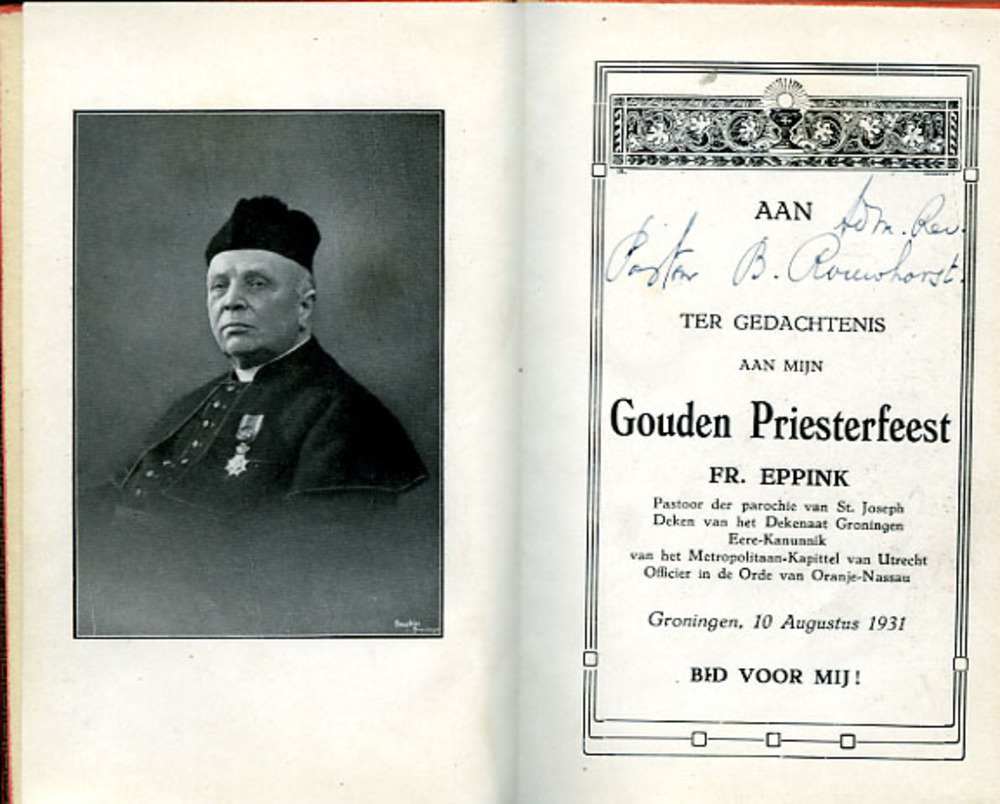 Kerkboekje door pastoor Fr. Eppink aan zijn gasten g...