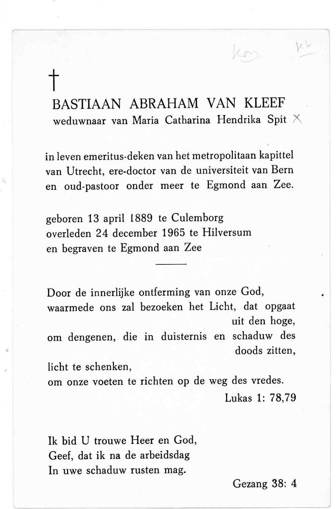 bidprent voor Bastiaan Abraham van Kleef. Geboren 13...