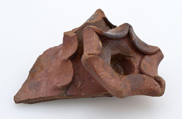 Fragment aardewerk vuurstolp, rode scherf, versierd ...
