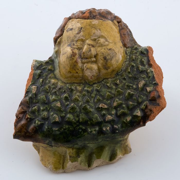Aardewerken gezicht met groene kraag, versiering van...