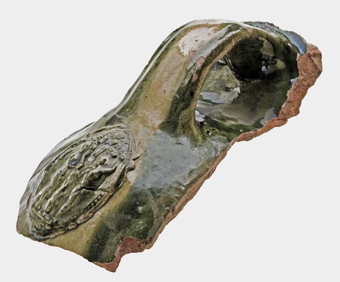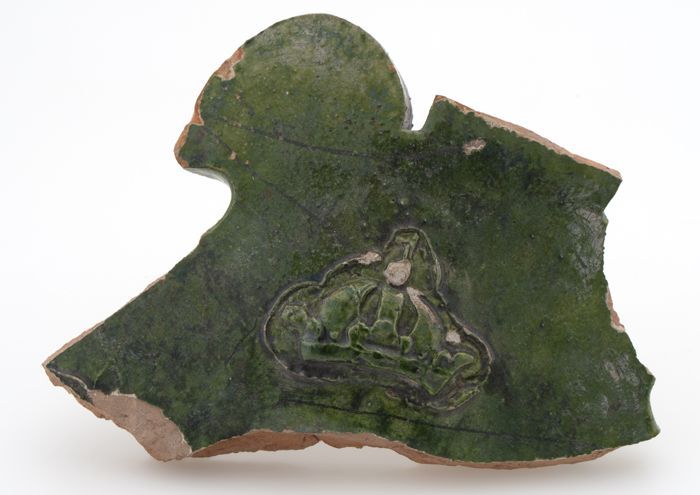 Groen fragment van aardewerk vuurstolp met kroon in ...