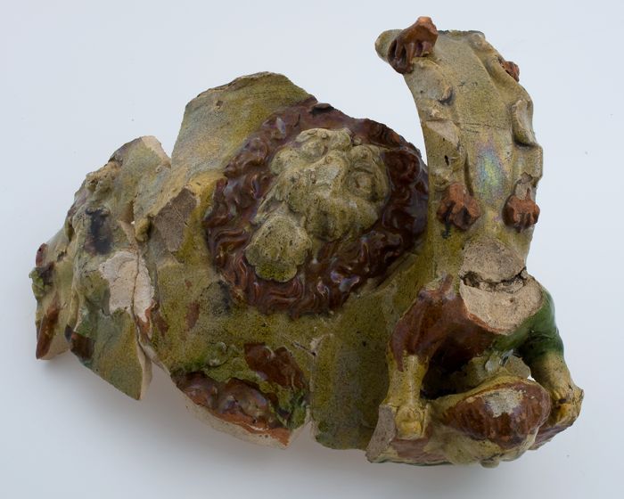 Fragment van aardewerk vuurstolp met leeuw in reliëf