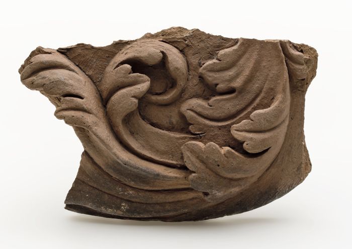 Fragment van terracotta ornament, versierd met acant...