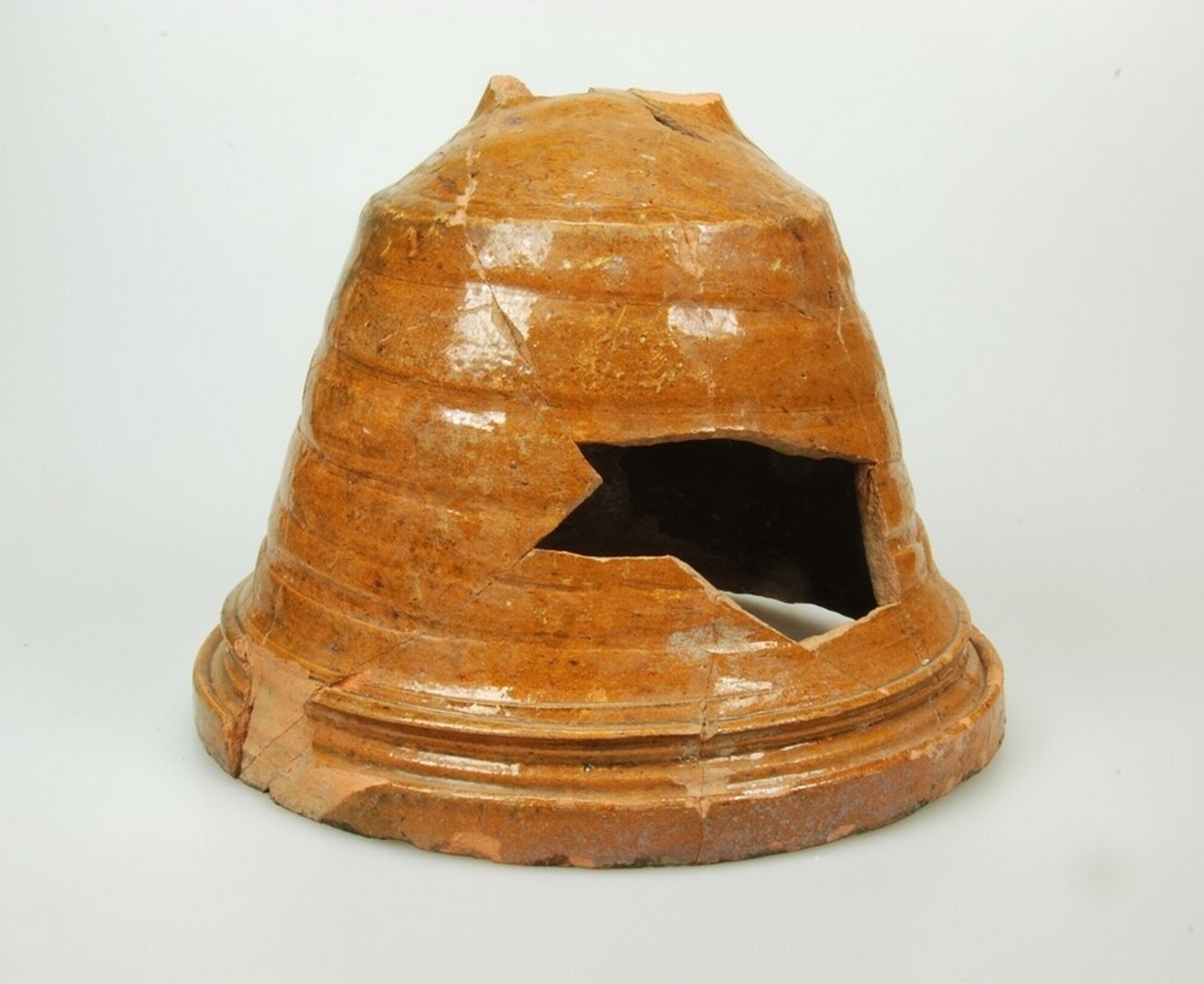 Fragmenten bont aardewerken vuurstolp, rode scherf, ...