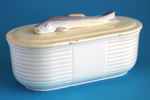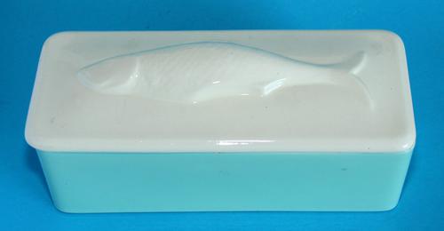 Dekschaal met als handgreep een vis op.losse deksel.