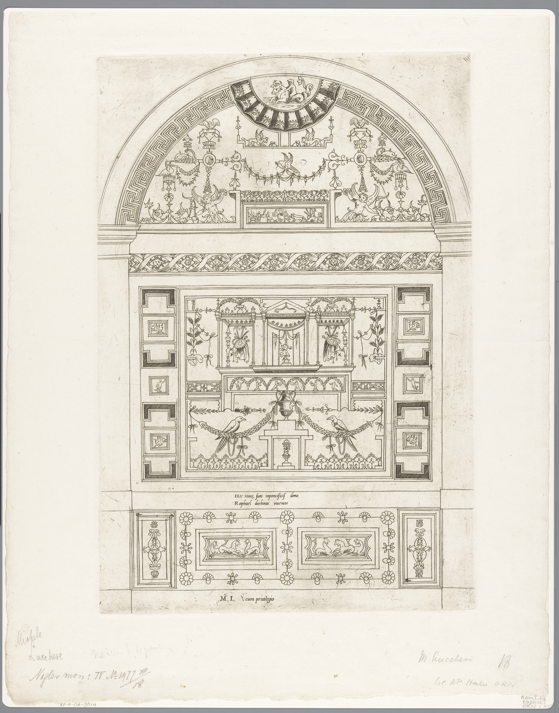Groteske wanddecoratie met vogels, hippocampussen, w...