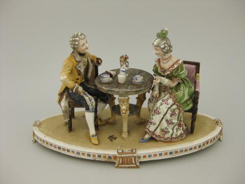 Beeldje van dame en heer aan tafel.