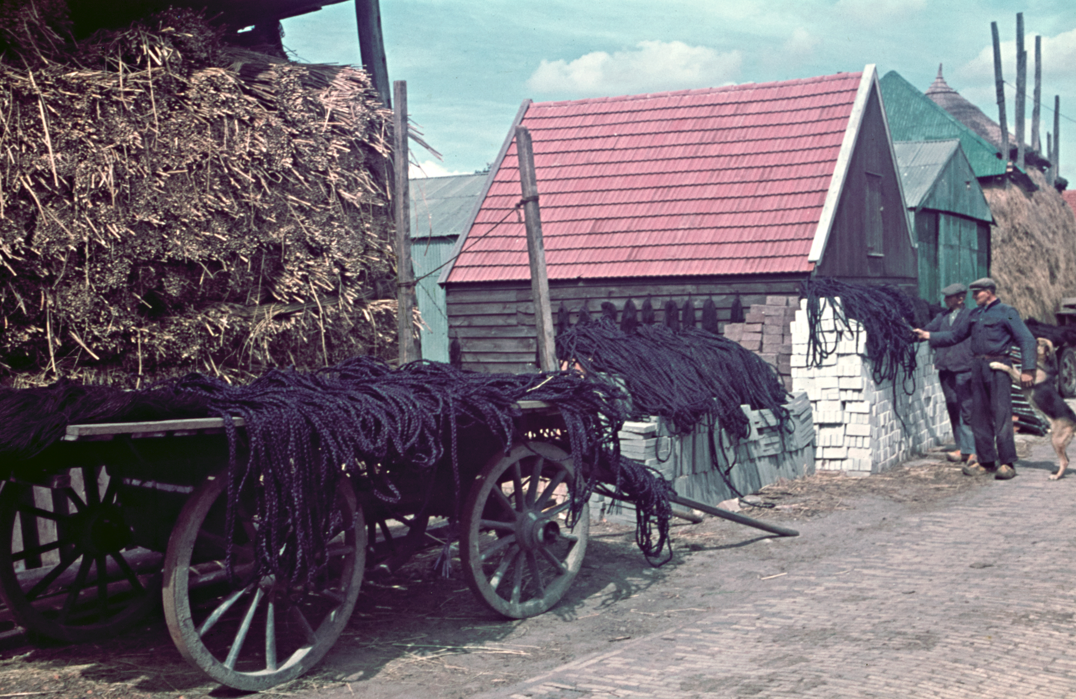 Straatbeeld met wagen met strengen