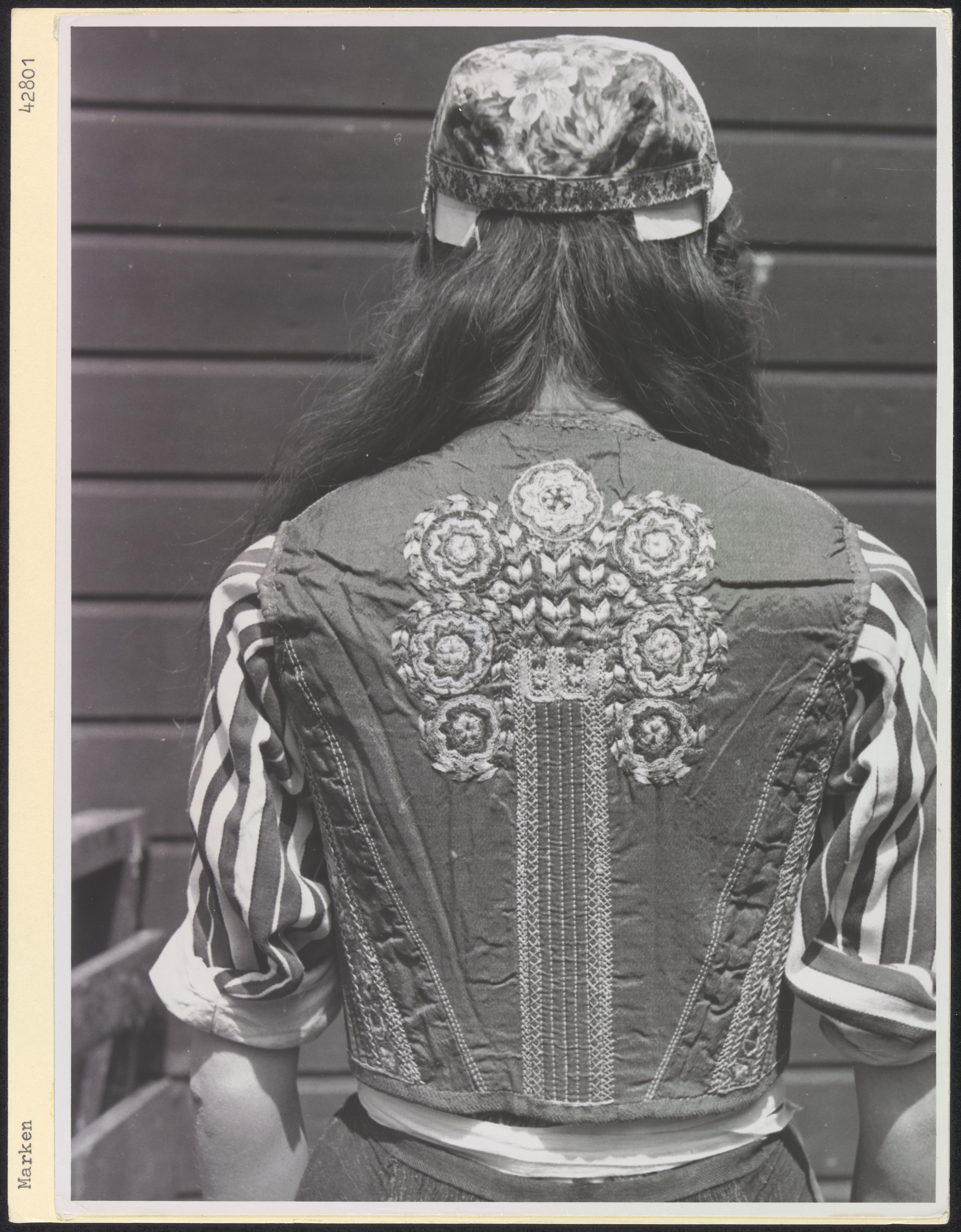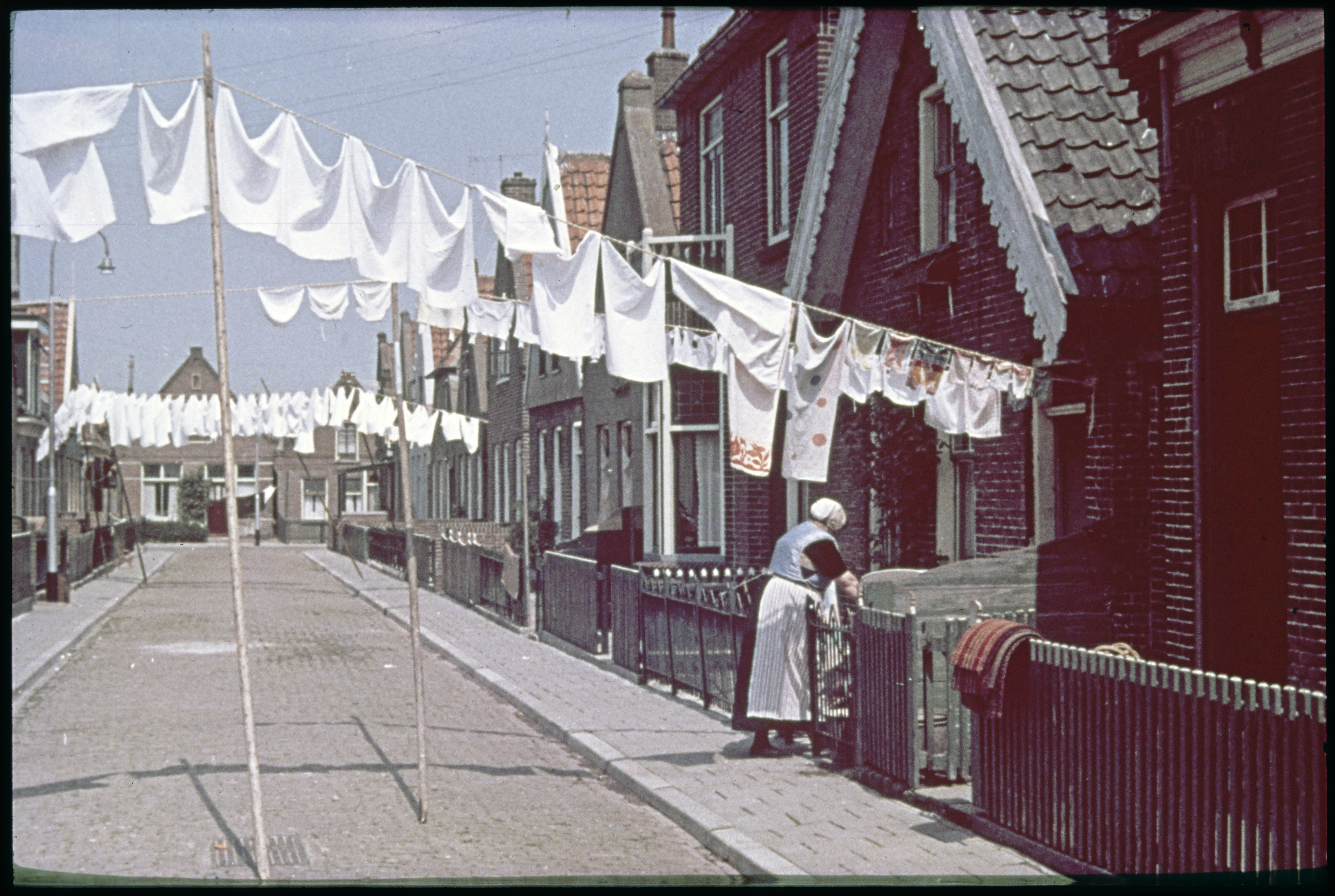 Vrouw in klederdracht voor visserswoning met kleding...
