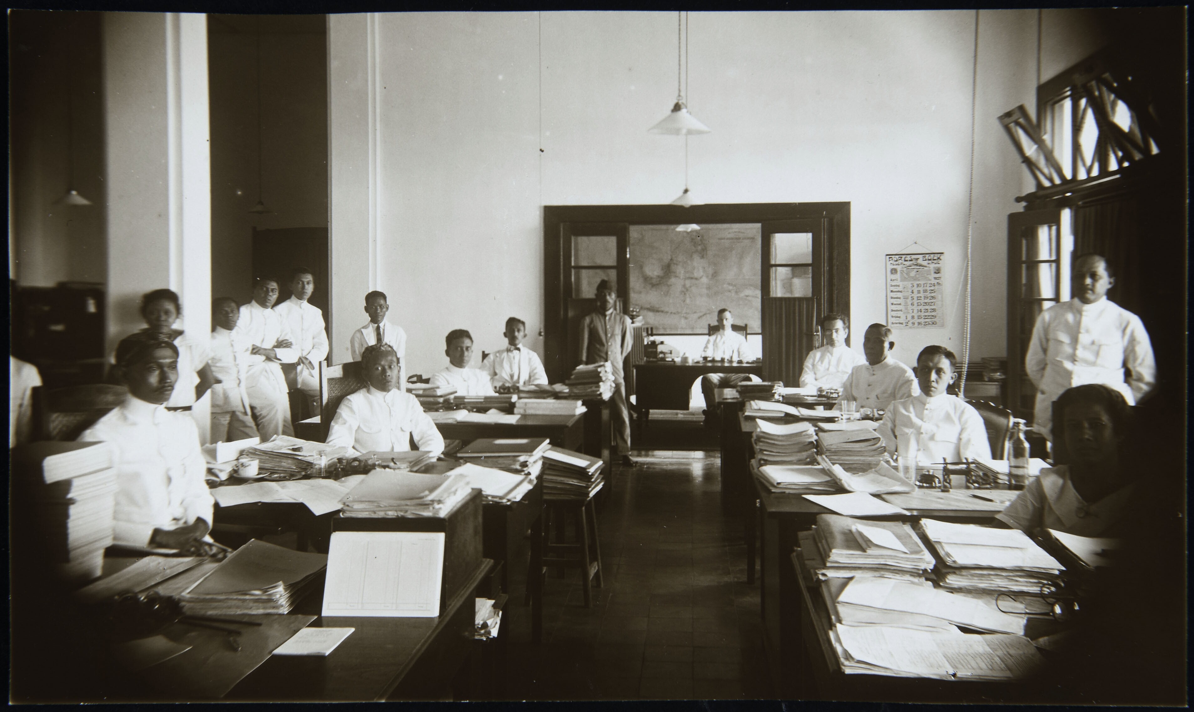 Portret van Dhr. M. Bos achter zijn bureau bij de PTT