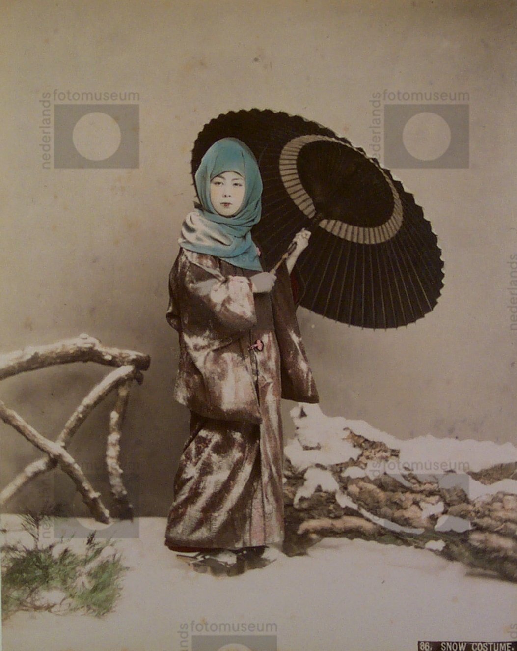 Winterscene, vrouw in de sneeuw met parasol, Japan (...