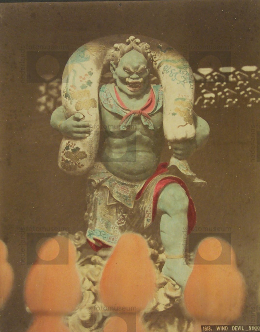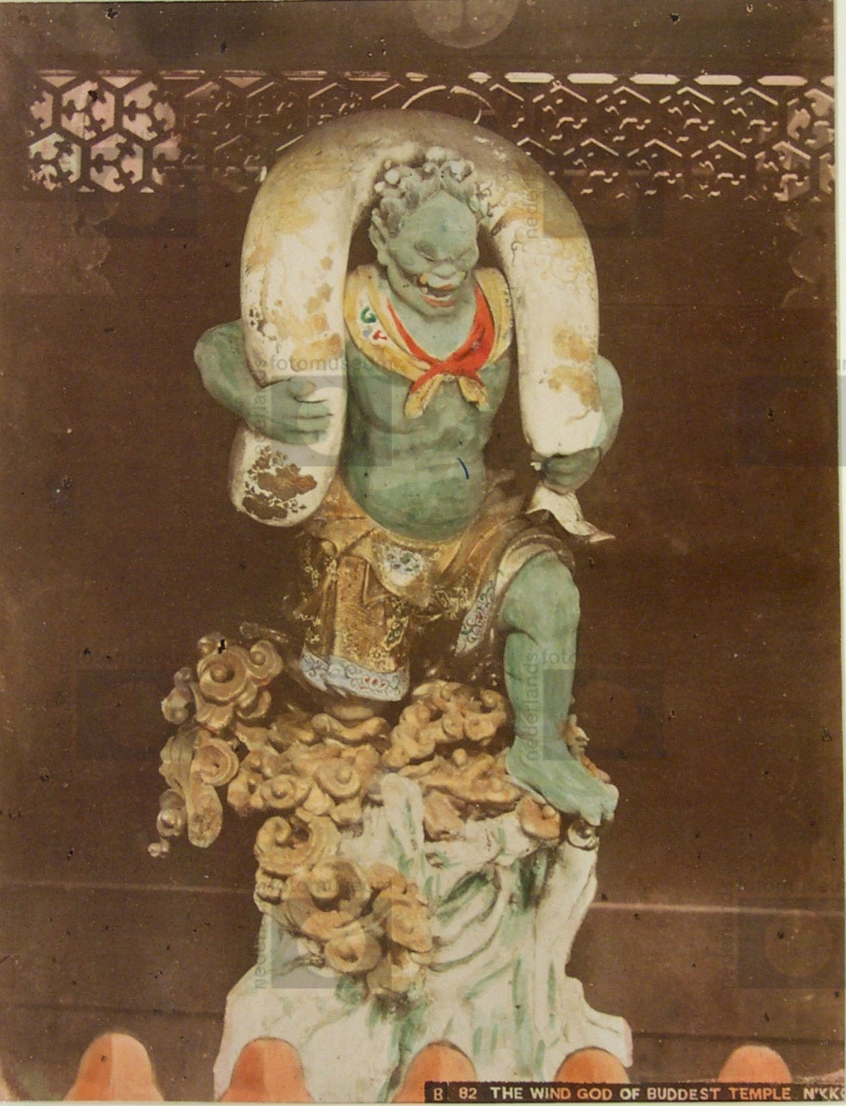 Sculptuur van windgod aan tempel, Nikko, Japan (1881...