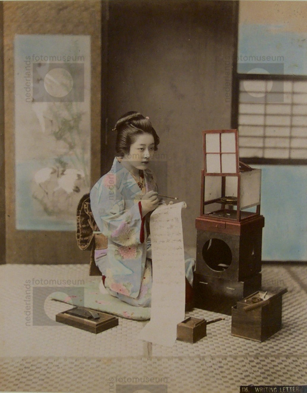 Vrouw calligrafeert een brief, Japan (1881-1914)