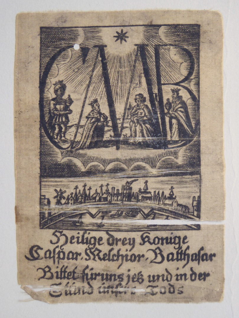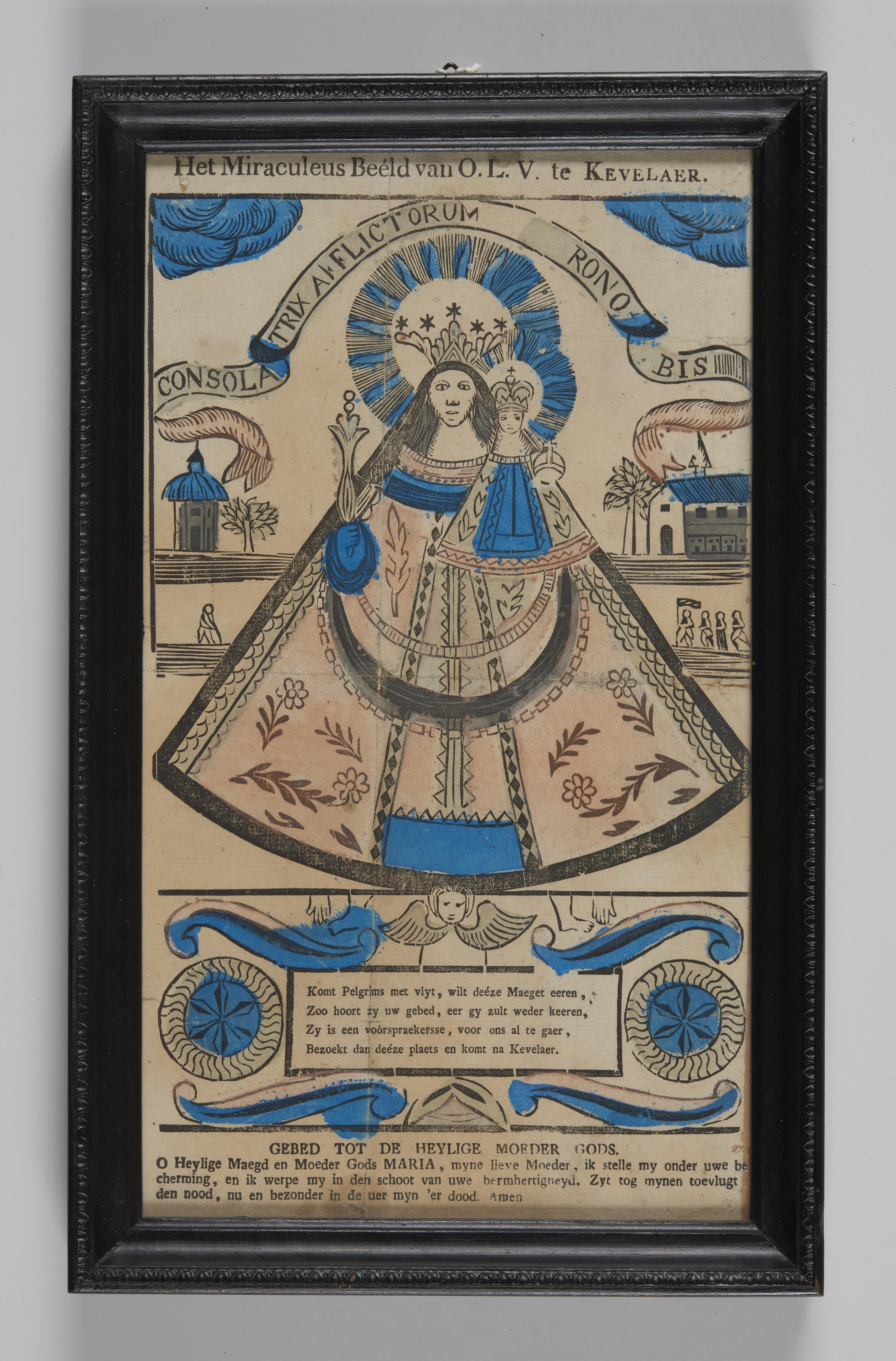 Opgeplakt devotieplaatje met reliekje en afbeelding ...