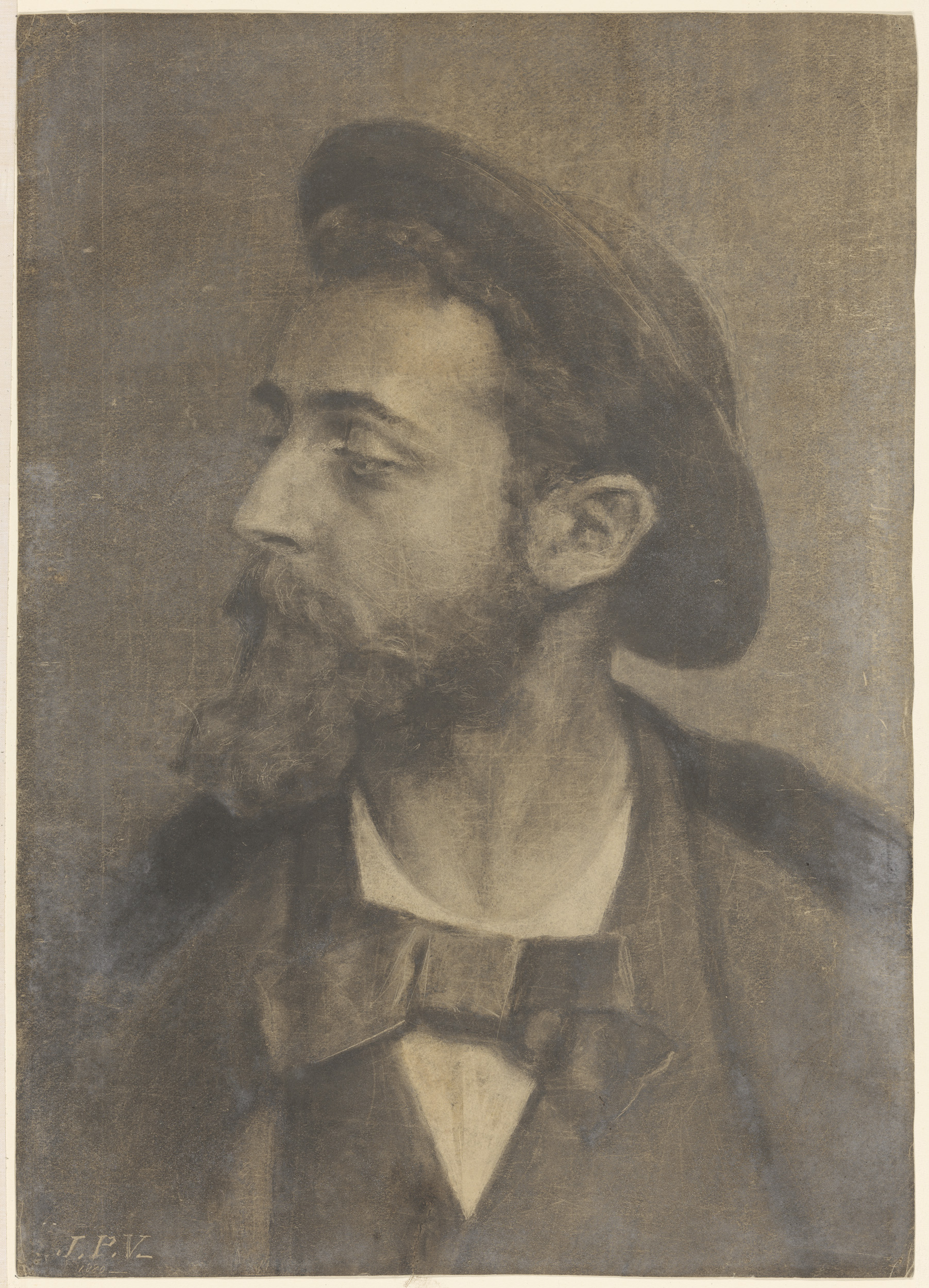 Portret van een man met baard en hoed, naar links