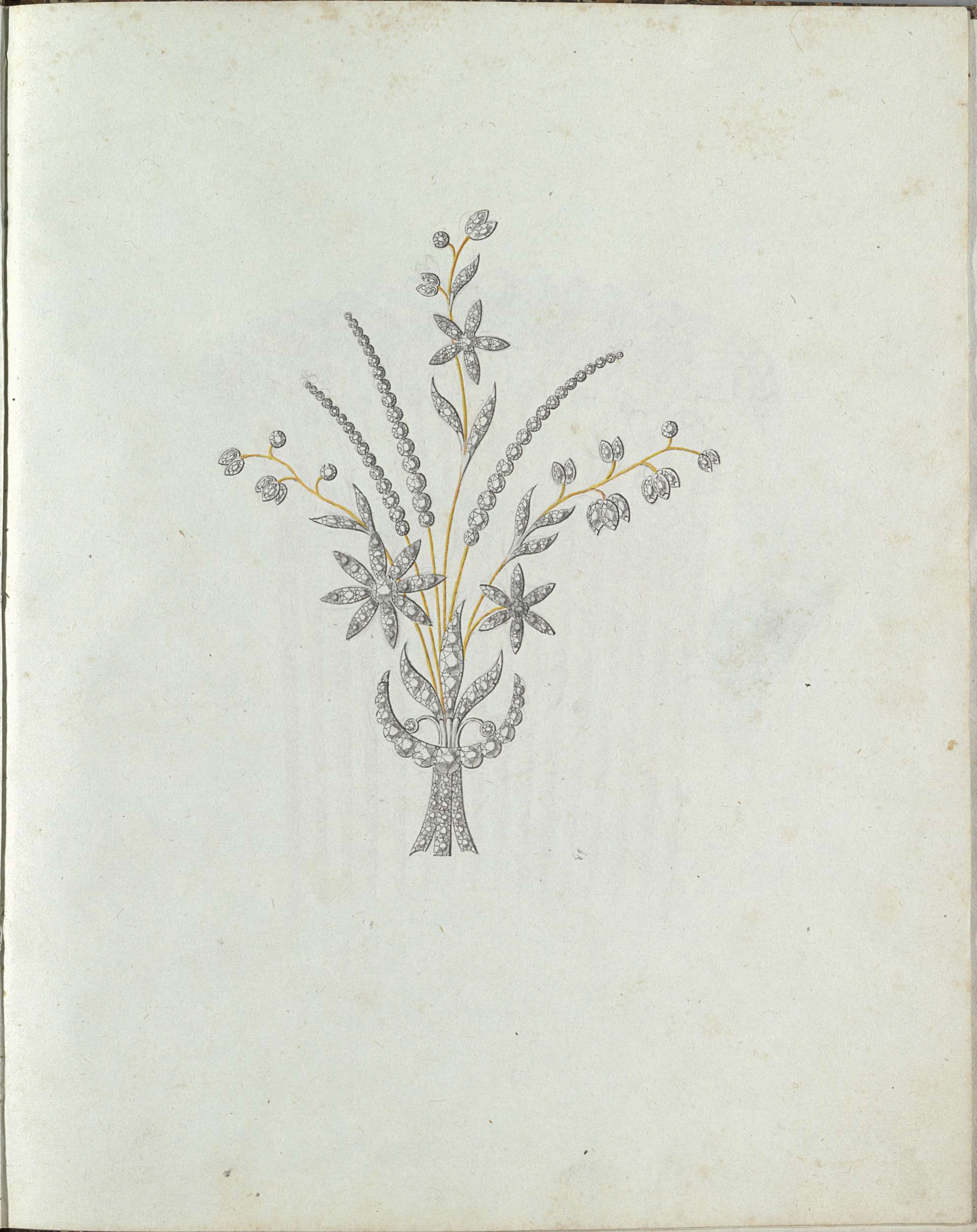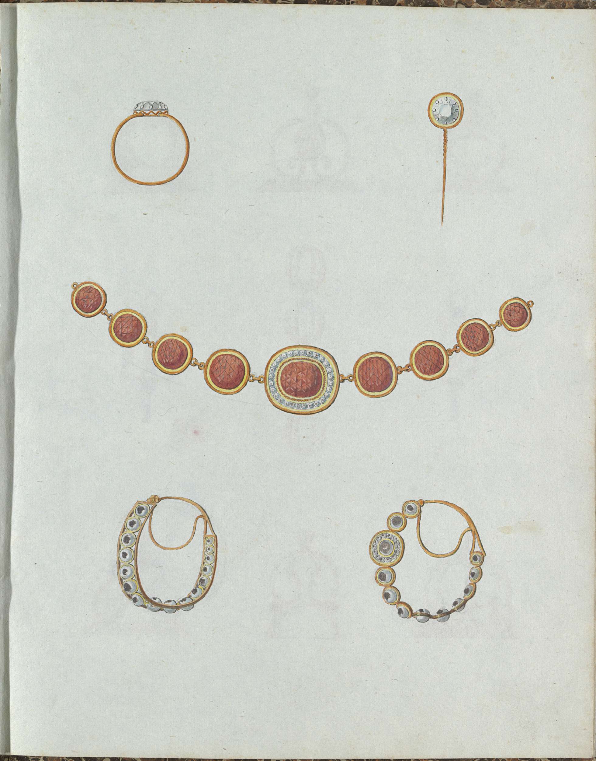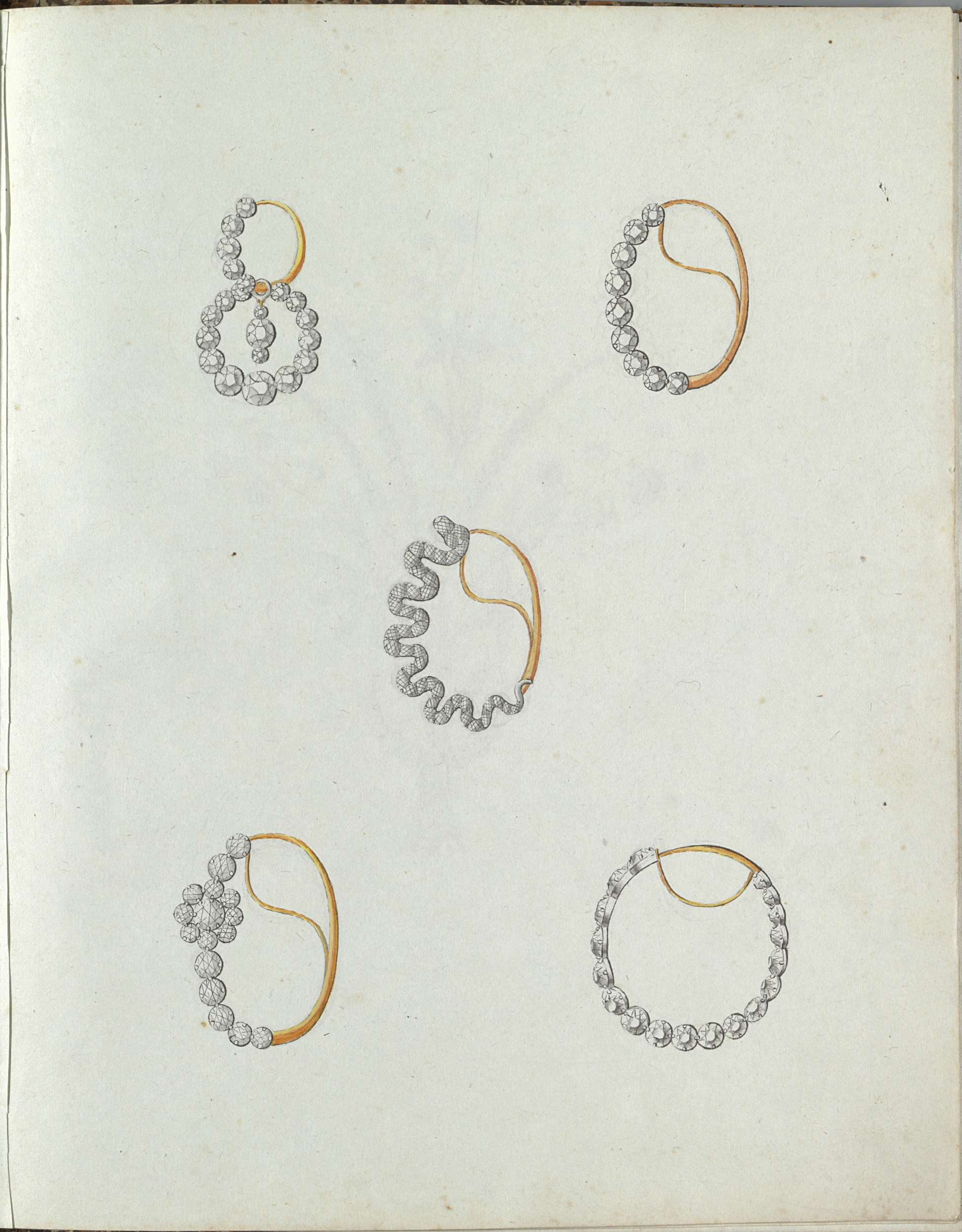 Vijf ontwerpen van oorbellen, waarvan één met een dr...