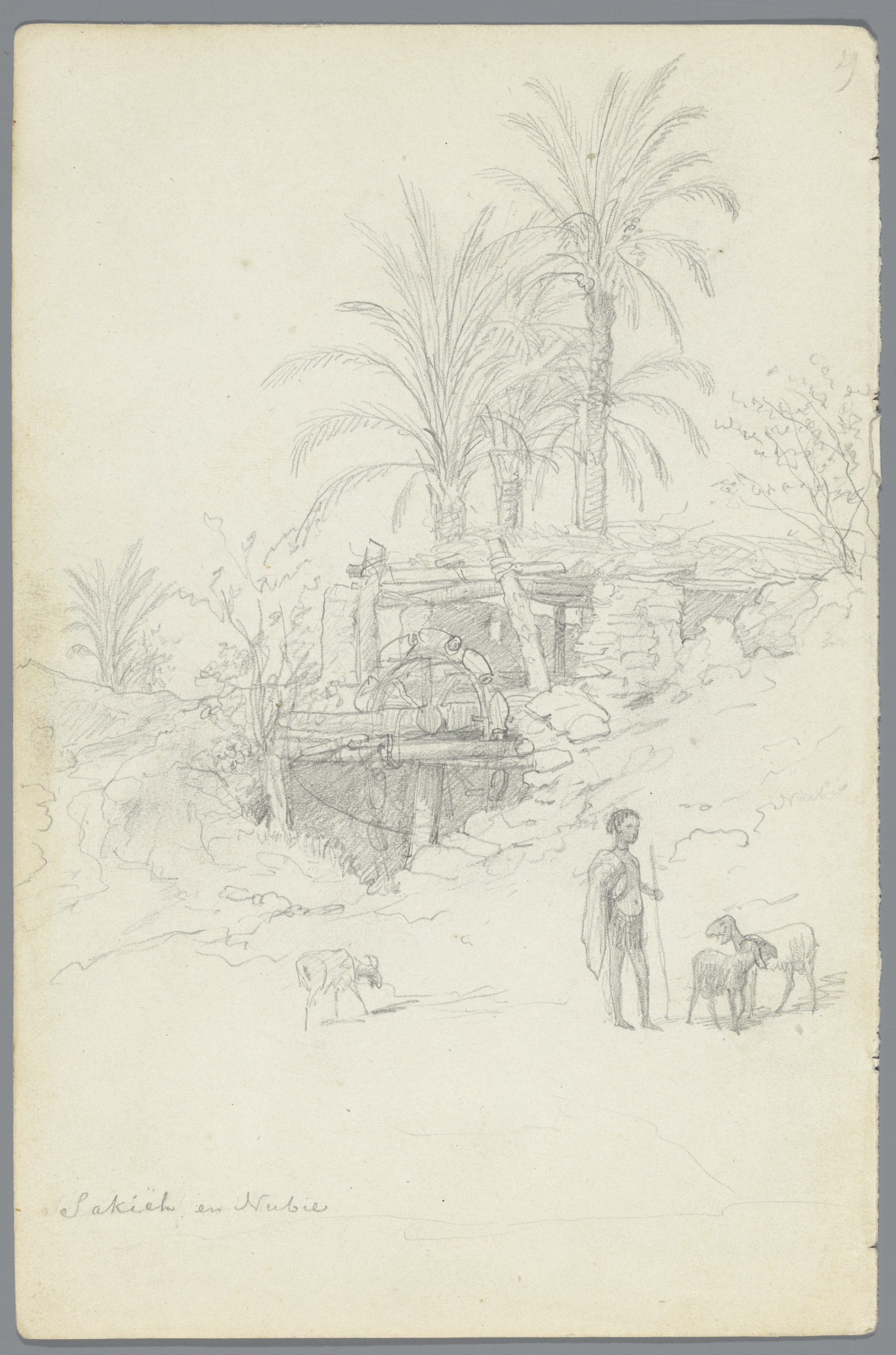 Gezicht op de oase Sakieh in Nubië, met waterput