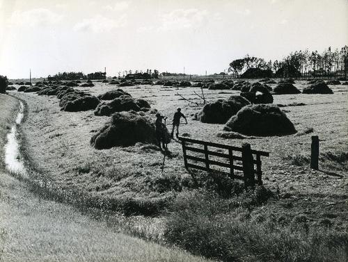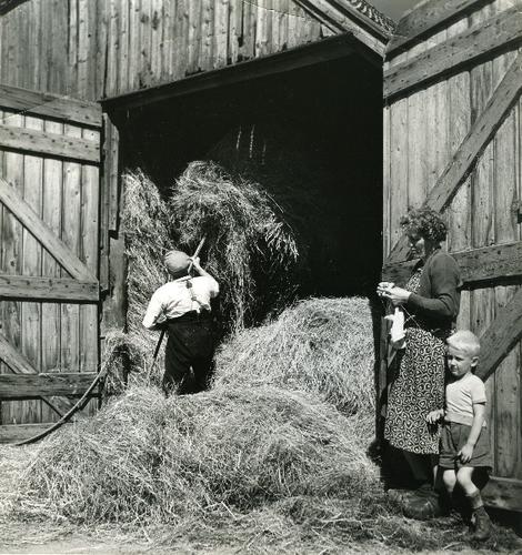 Foto in zwart-wit van het handmatig opladen van hooi...