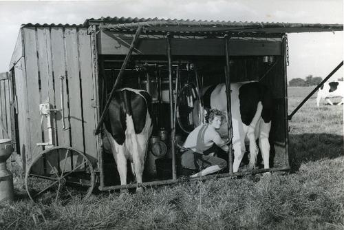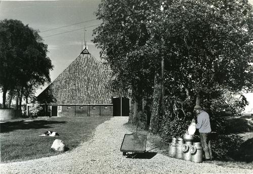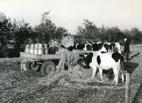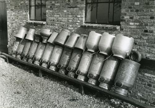 Foto in zwart-wit van een vol melkbussenrek door J.D...