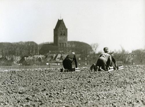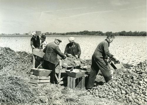 Foto van het handmatig rapen van aardappelen vlak bi...