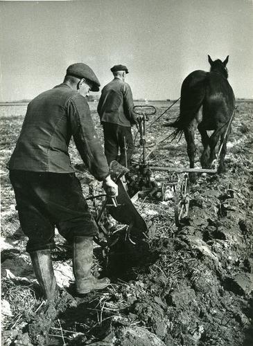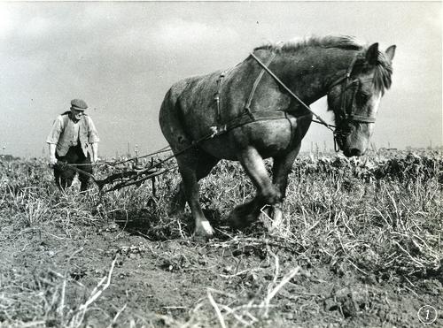 Foto in zwart-wit van een wentelploeg met een paard ...