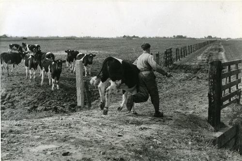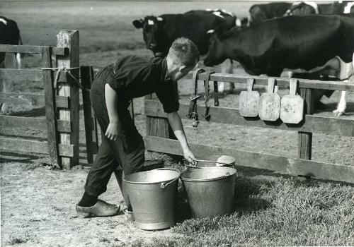 Foto in zwart wit van een jongen met melkemmers bij ...
