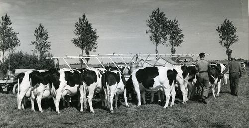 Foto in zwart-wit van koeien bij een weidemelkinstal...
