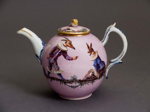 Theepot met deksel, versierd met Commedia dell'arte ...