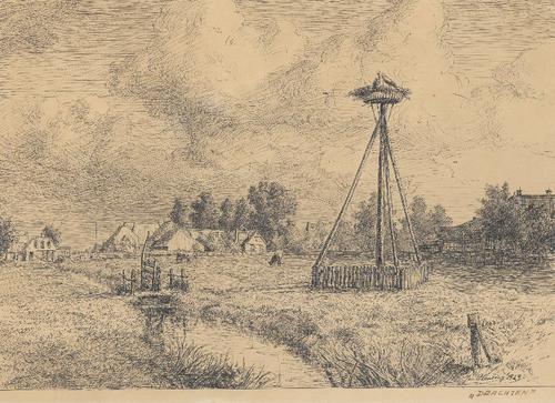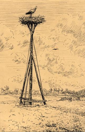 Tekening van een ooievaarsnest bij Het Zuid te Drachten