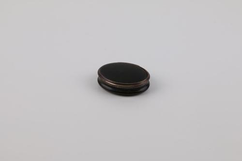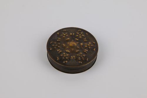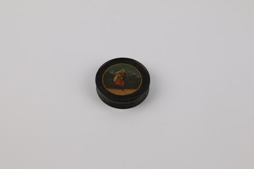 Ronde donkerkleurige snuifdoos met op het deksel de ...