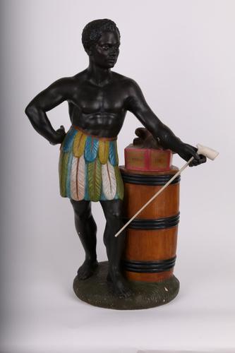 Beeld van inheemse negroïde man, leunend met pijp in...