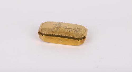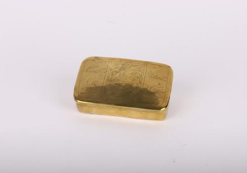Messing tabaksdoos met in reliëf een molen en huizen