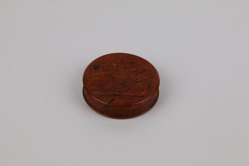 Ronde houten snuifdoos met voorstelling van een schi...