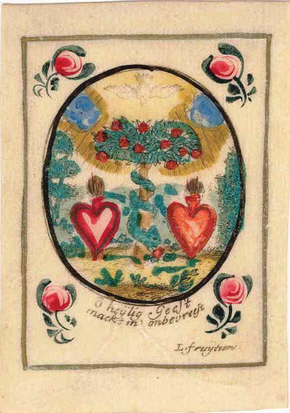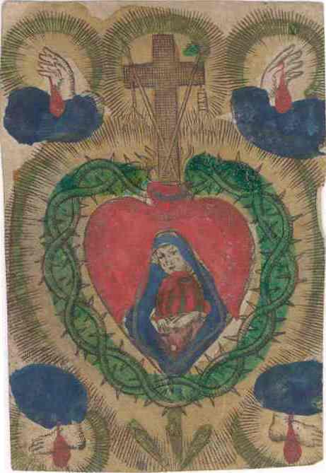 Brandende harten van Maria en Jezus aan weerszijde v...