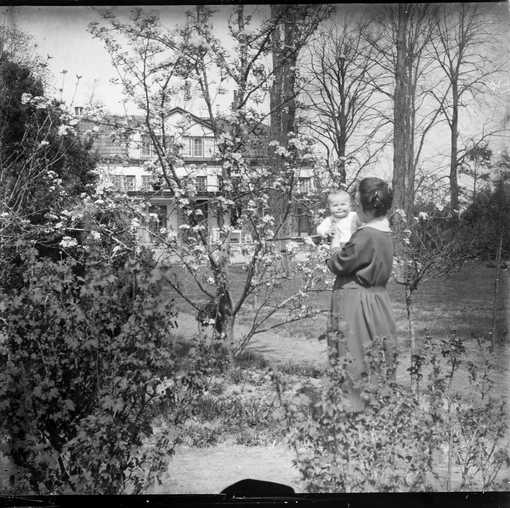 Vrouw met baby in de tuin van Huize 'Den Hoek' in Ni...