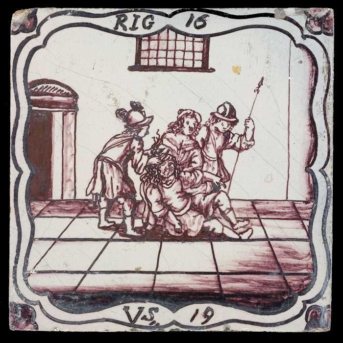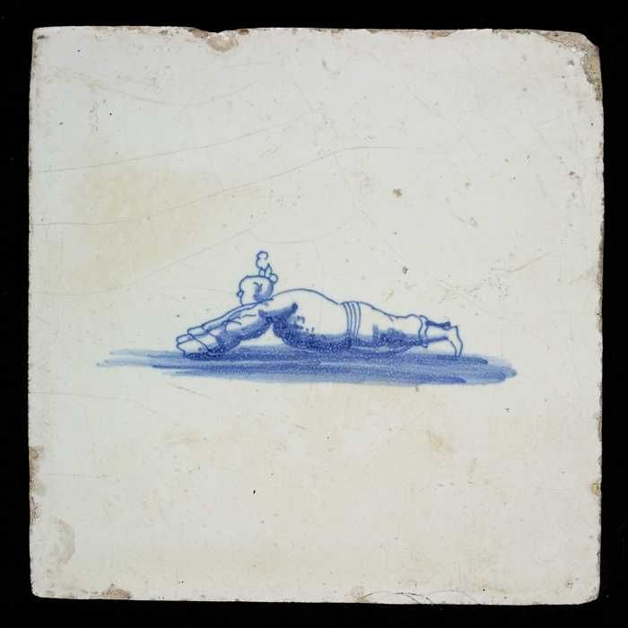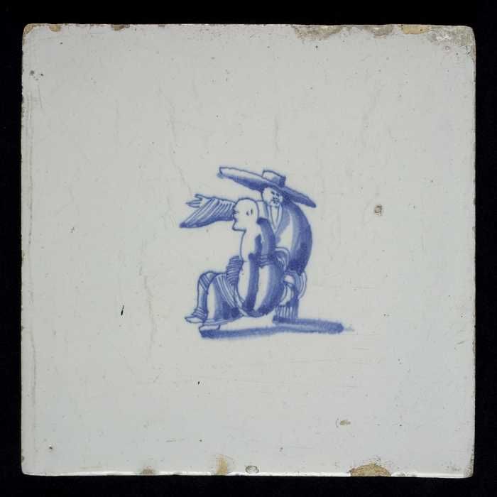 Tafereeltegel, herder met stok, hoekmotief lelie
