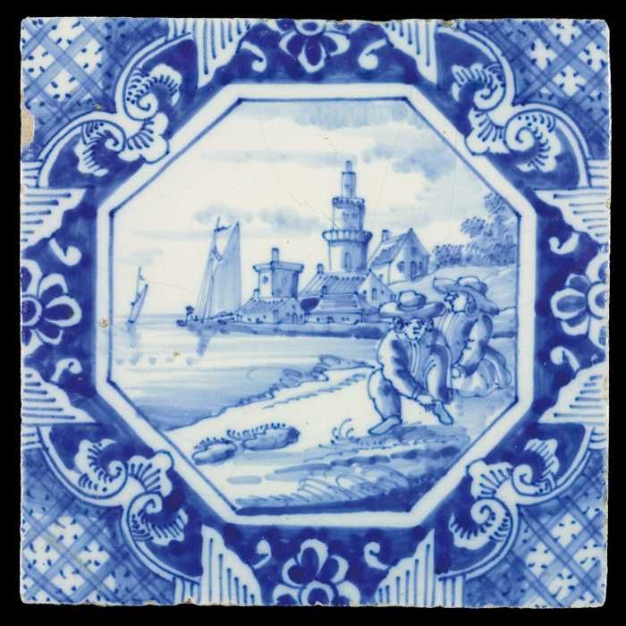 Tafereeltegel met landschap, scheepjes en vuurtoren,...