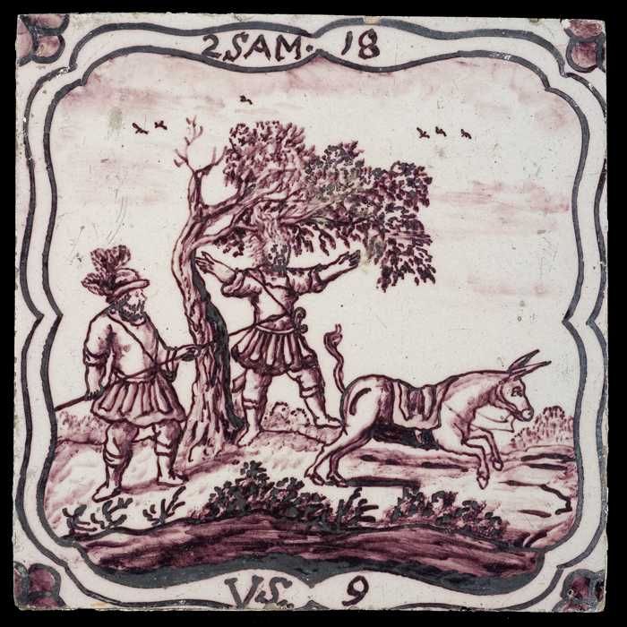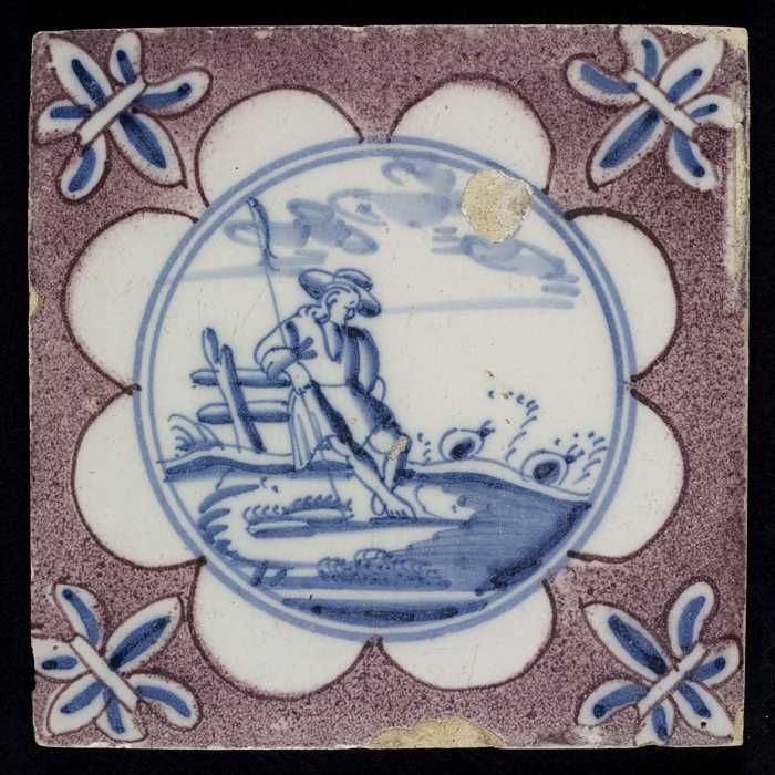 Tafereeltegel, herder met stok, hoekmotief lelie